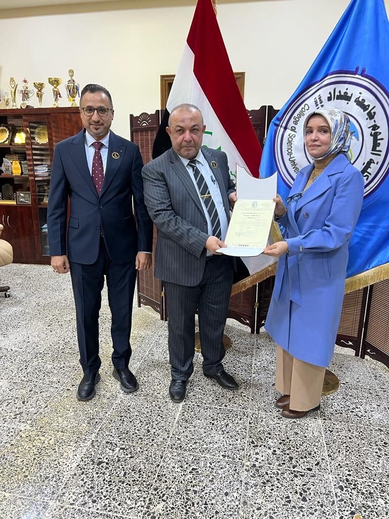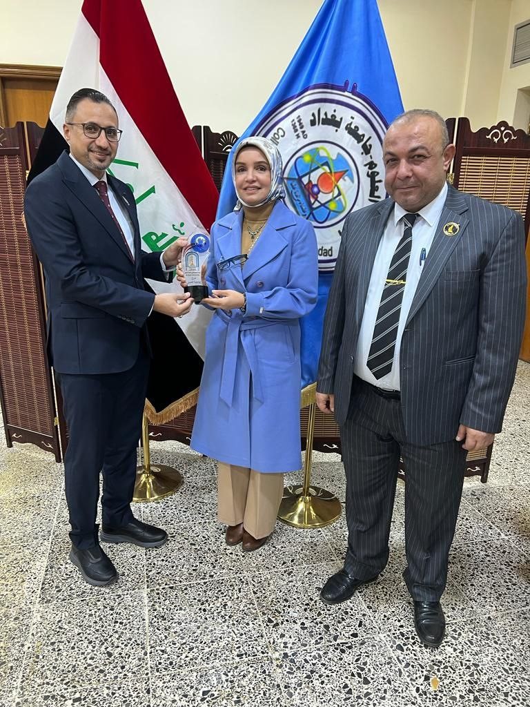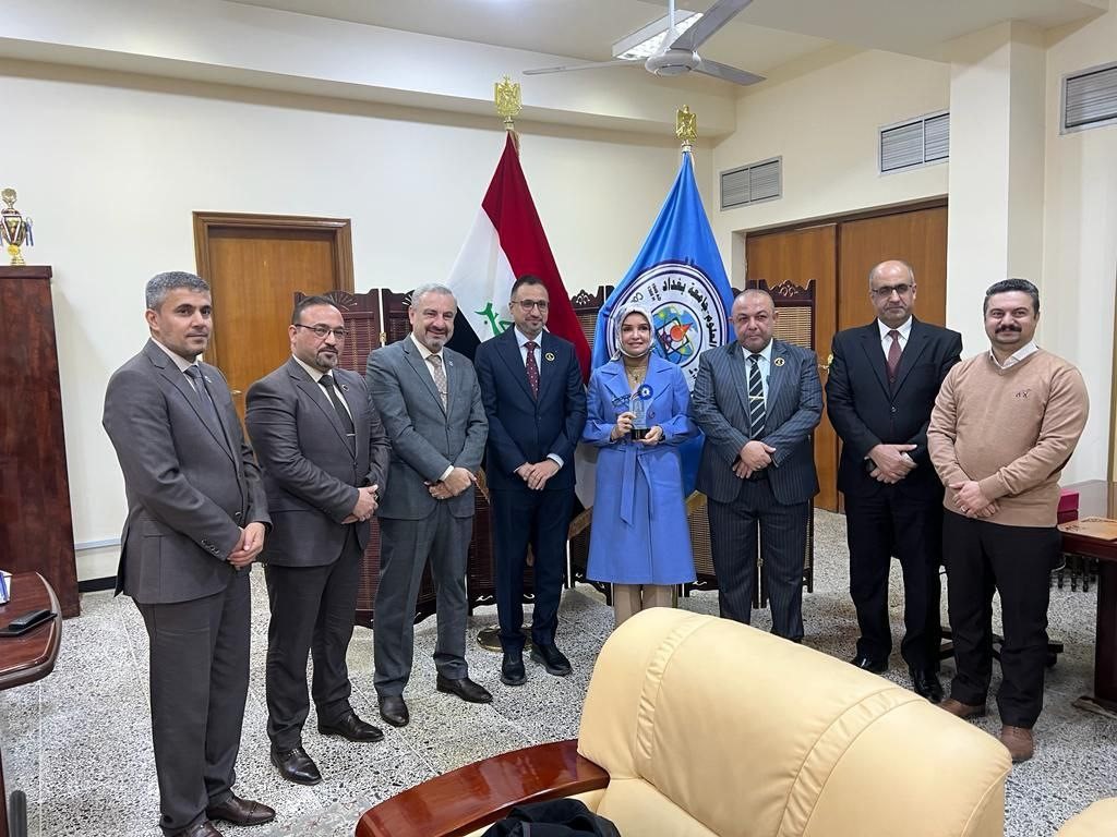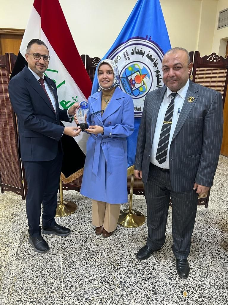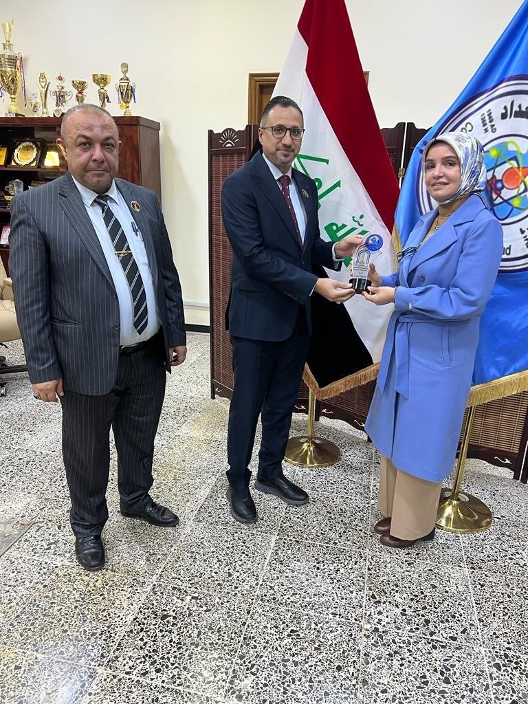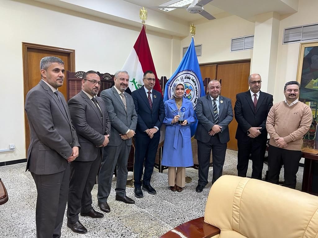 The President of Al-Ayen University, Prof. Dr. Shafik Sh. Al Mawla, and the Vice-President for Administrative Affairs, Associate Professor Dr. Atheer Y. Odeh visited the Deanship of the College of Science, represented by its Dean, Prof. Dr. Abdul Karim Al-Qazzaz, in order to honor the Head of the Department of Chemistry , Associate Professor Dr. Nada Al-Abedi, for her great efforts in an initiative to manage the honoring ceremony for the winners of the Al-Ayen University Prize for the Iraqi academic researcher last January.