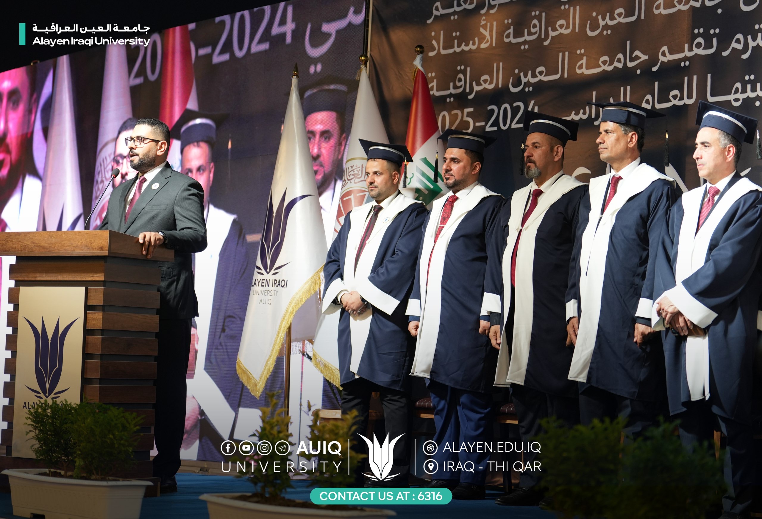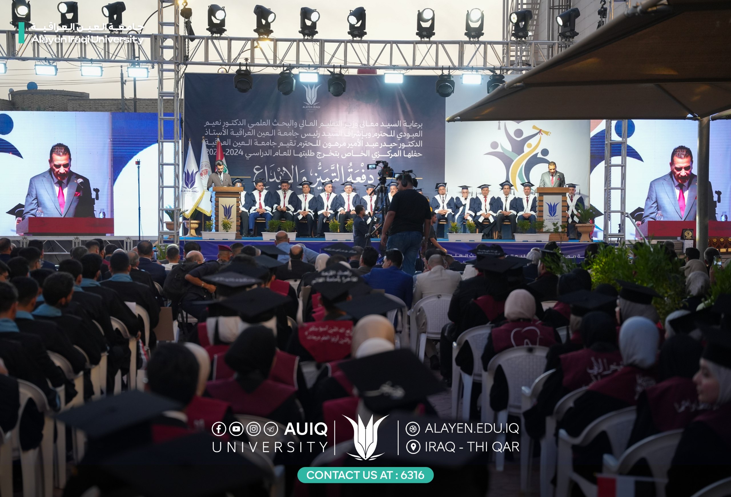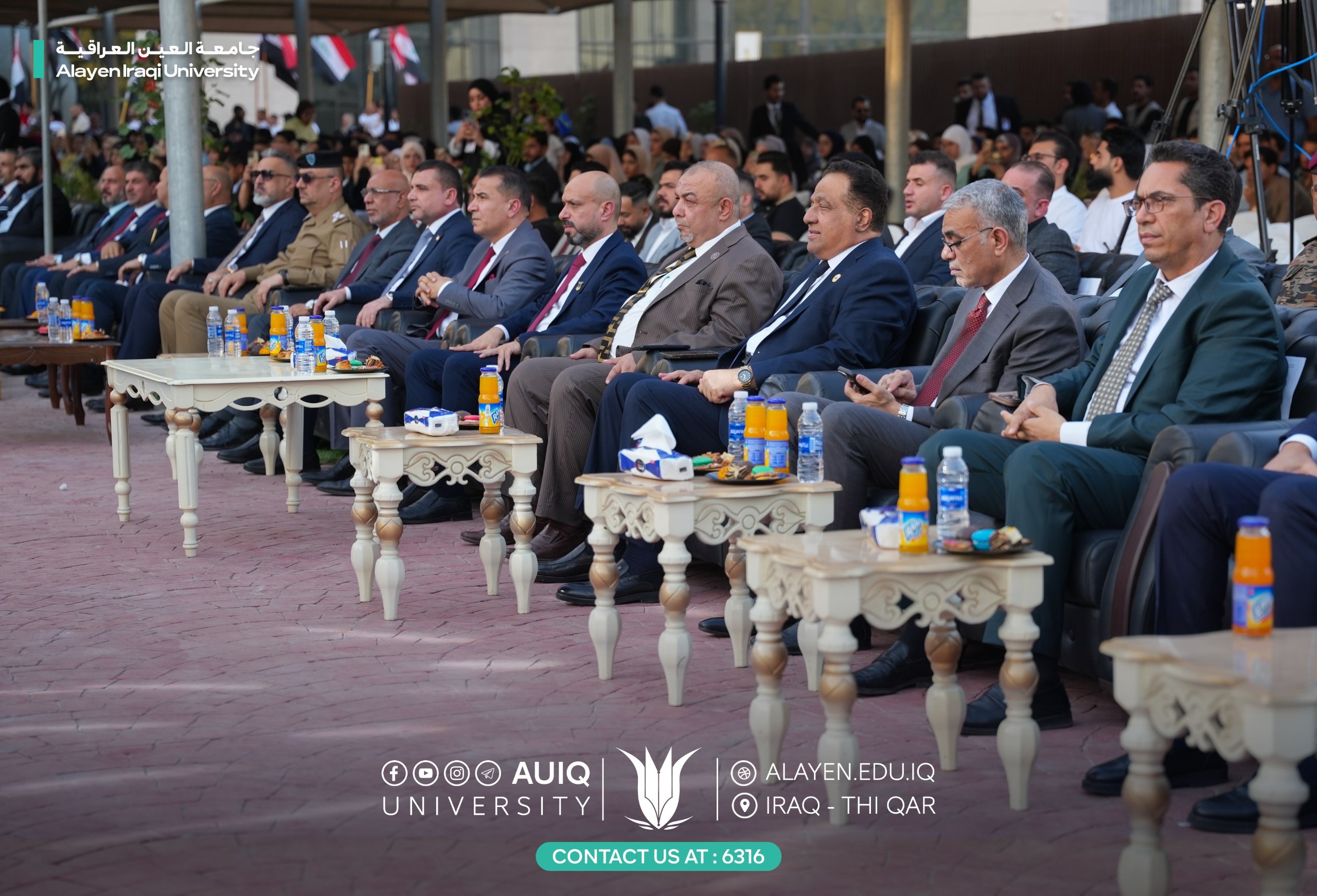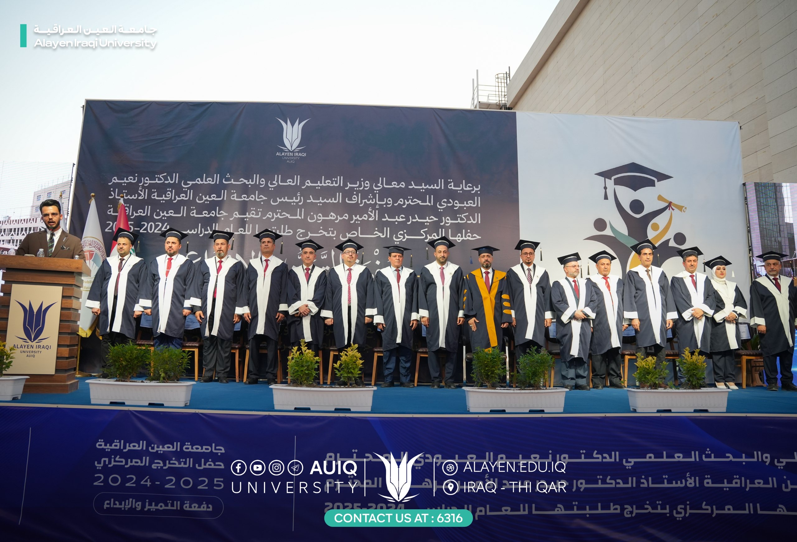 Al-Ayen Iraqi University held studens' central graduation ceremony for the academic year 2024-2025, attended by the Advisor to the Ministry of Higher Education and Scientific Research, representing His Excellency the Minister, the President of the Scientific Research Authority, the Governor of Dhi Qar, his First Deputy, and the presidents of the universities of Dhi Qar, Sumer, and Shatrah, as well as a number of assistant university presidents, deans, and directors of official departments in Dhi Qar Province. The ceremony was held in a festive atmosphere that embodied the students' joy at the fruits of their academic years and continuous efforts.