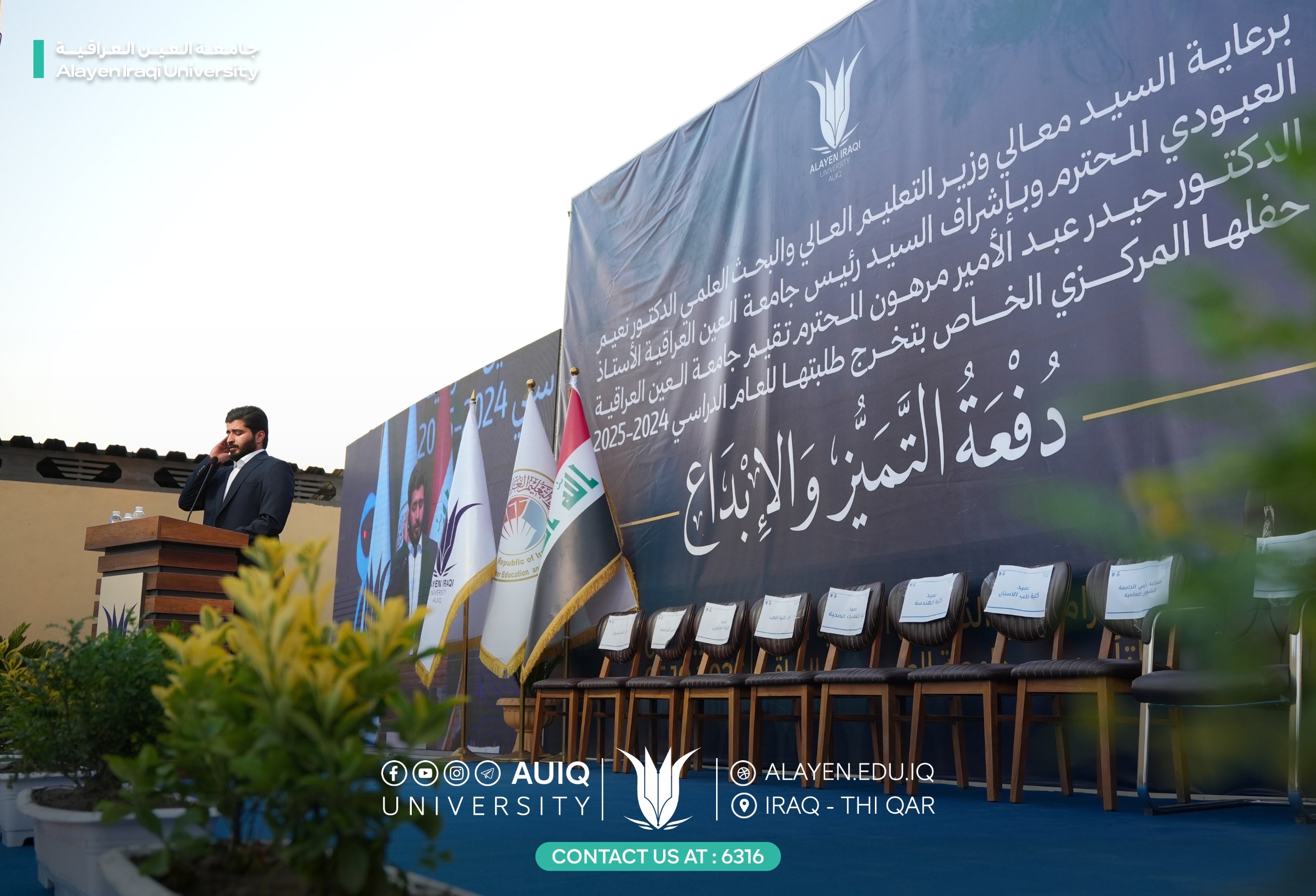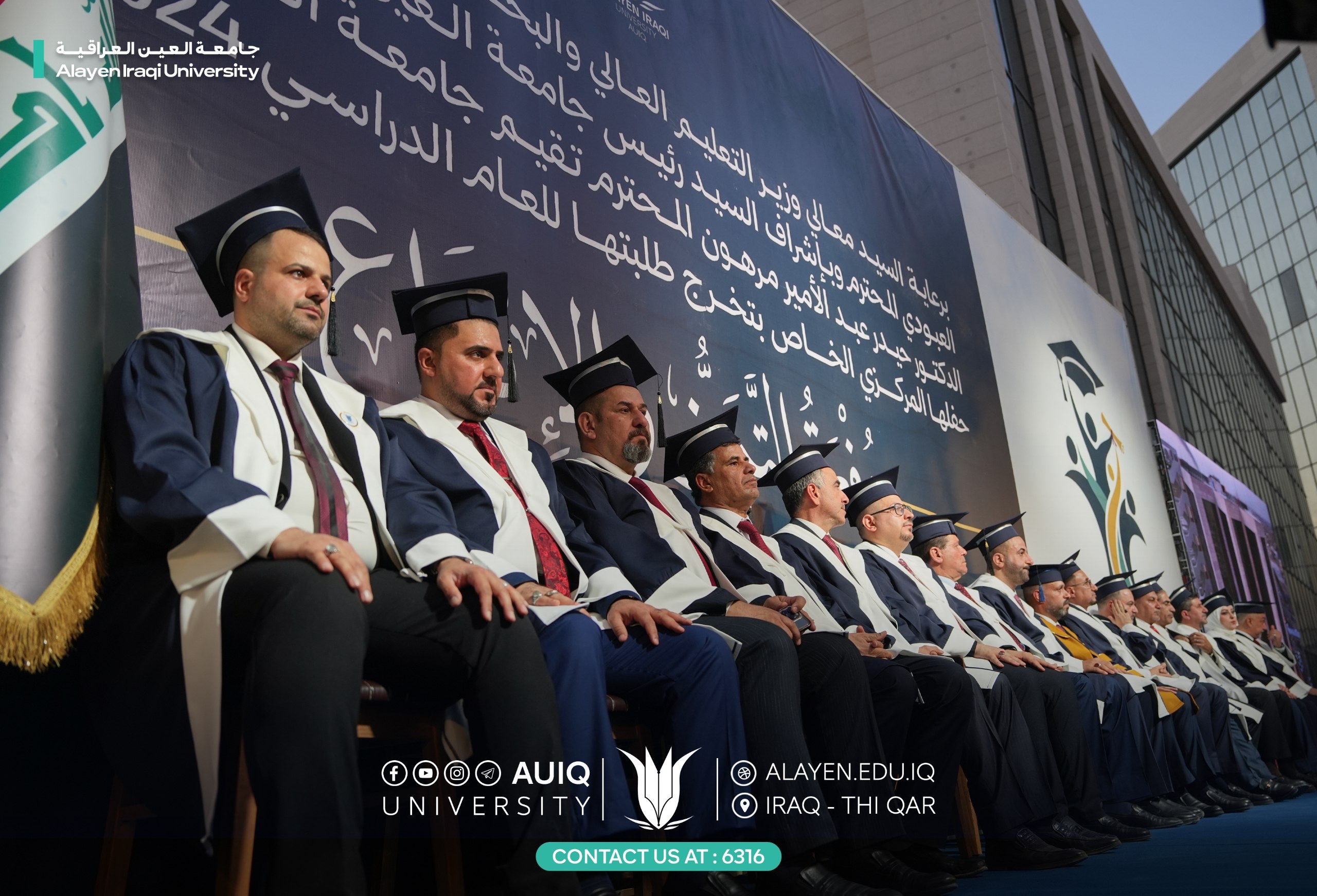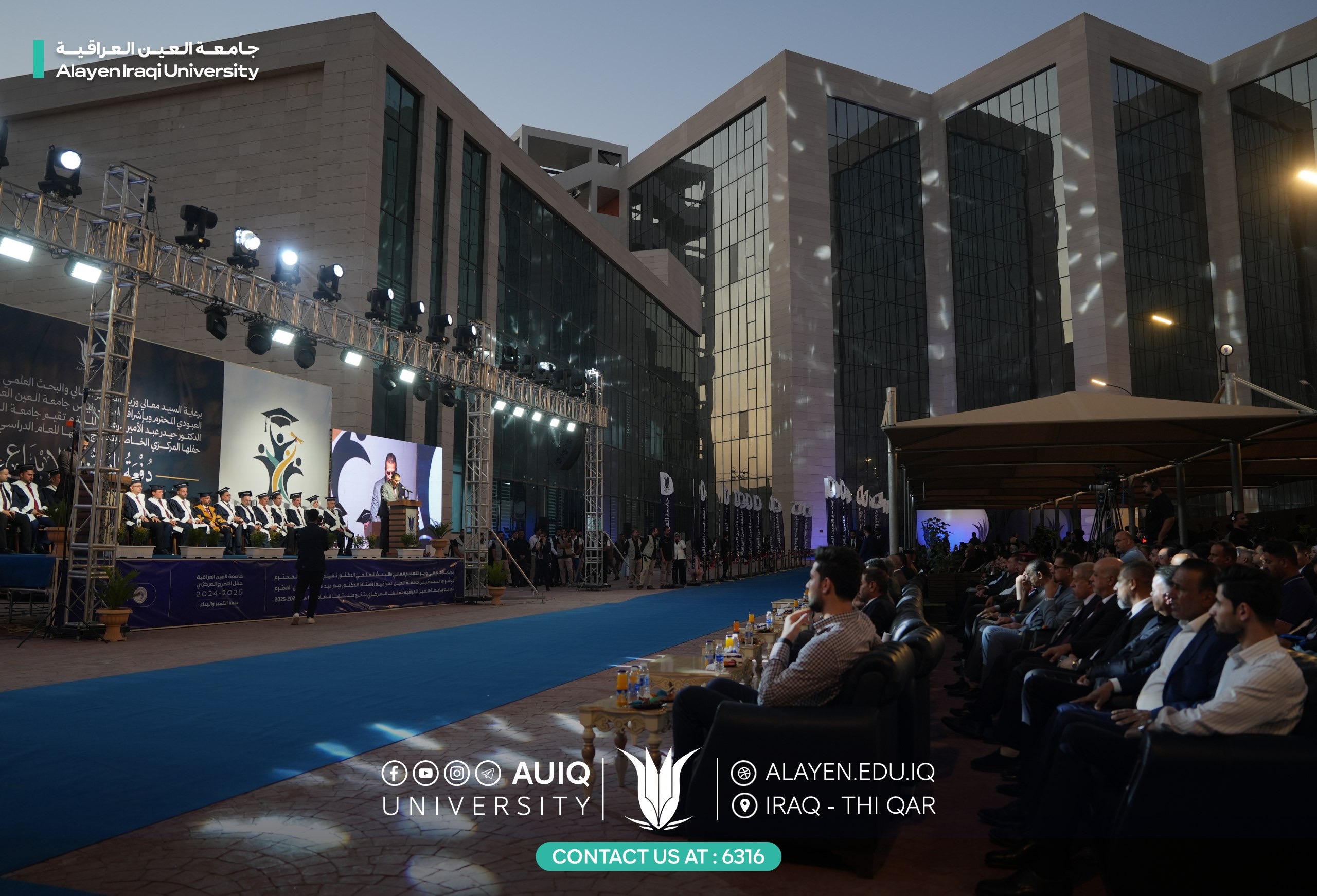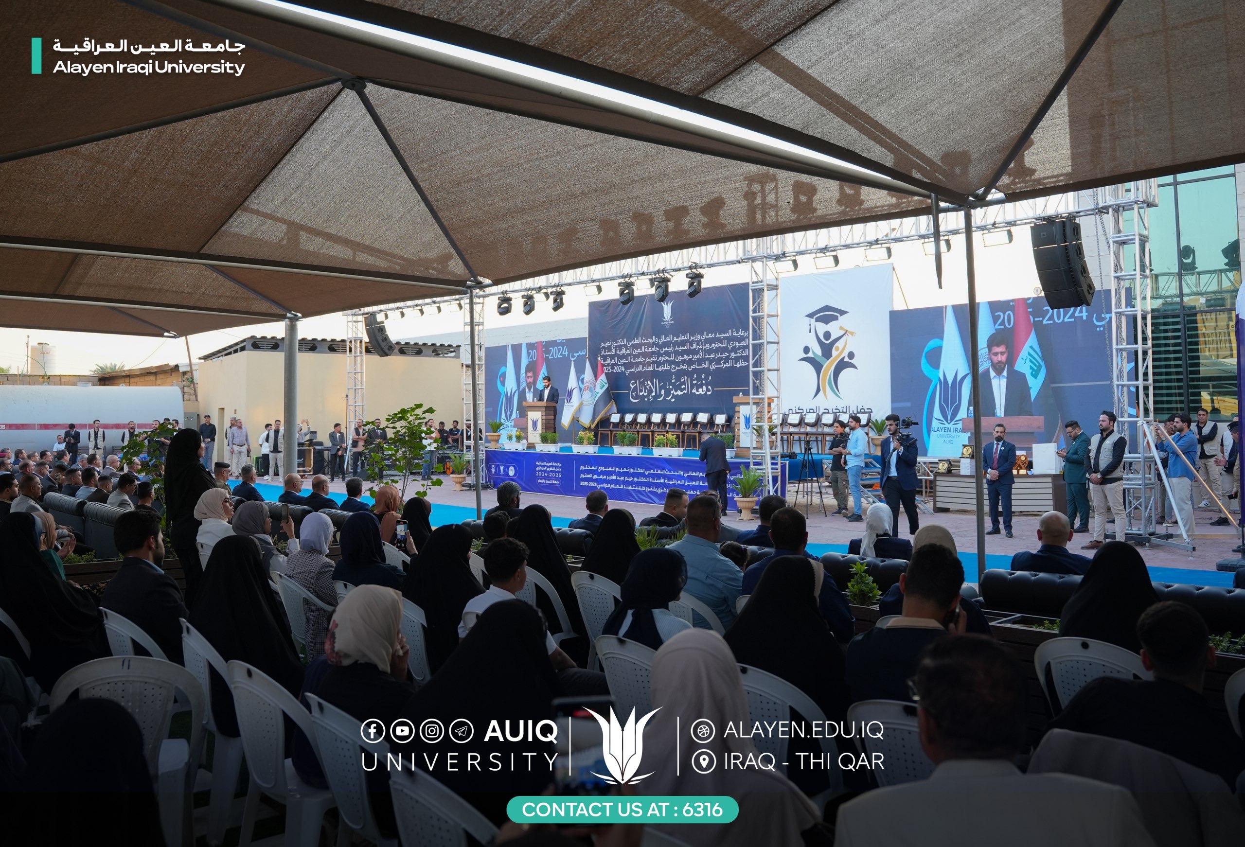 Al-Ayen Iraqi University held studens' central graduation ceremony for the academic year 2024-2025, attended by the Advisor to the Ministry of Higher Education and Scientific Research, representing His Excellency the Minister, the President of the Scientific Research Authority, the Governor of Dhi Qar, his First Deputy, and the presidents of the universities of Dhi Qar, Sumer, and Shatrah, as well as a number of assistant university presidents, deans, and directors of official departments in Dhi Qar Province. The ceremony was held in a festive atmosphere that embodied the students' joy at the fruits of their academic years and continuous efforts.