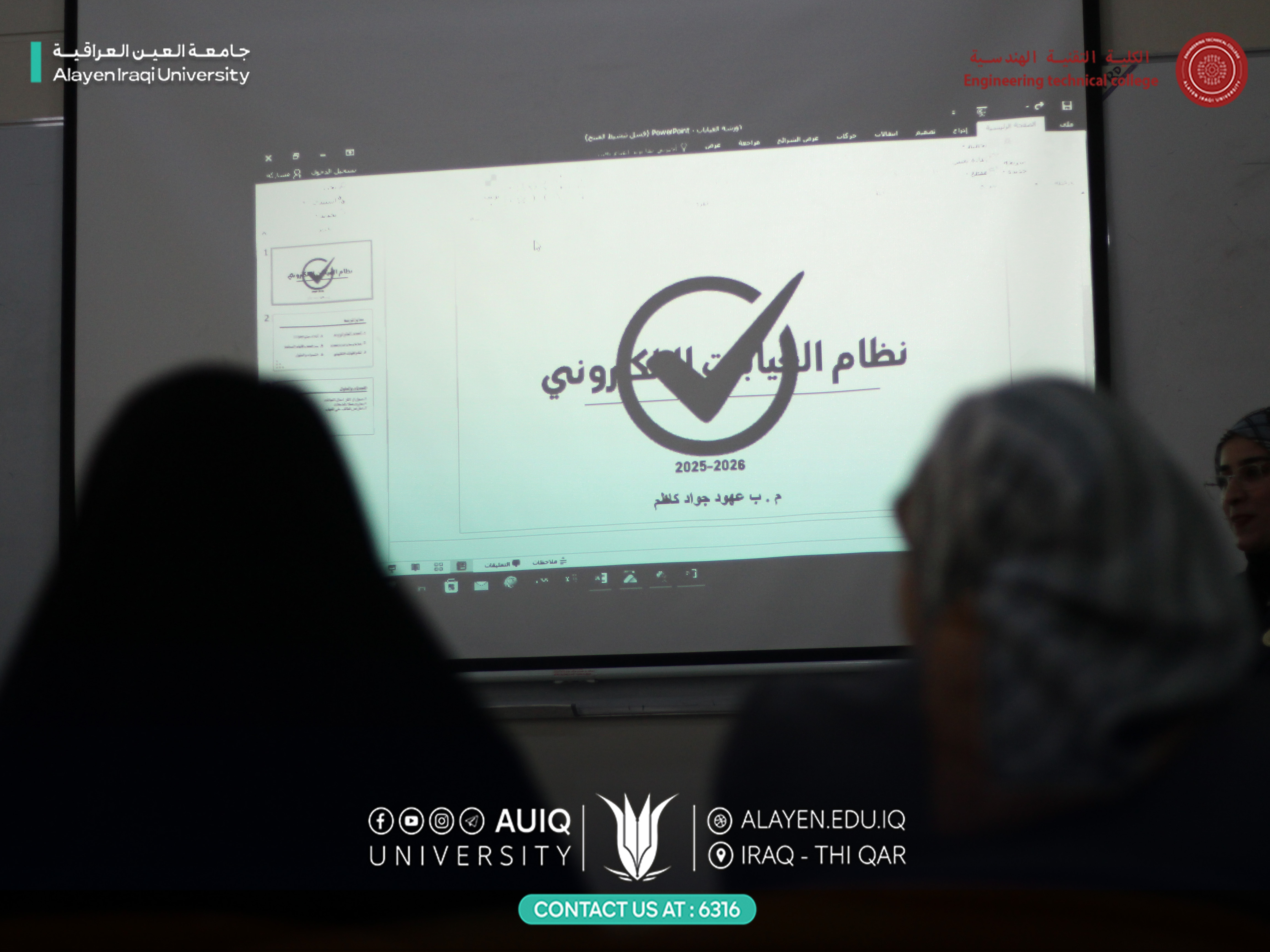 The Continuing Education Unit at the College of Engineering Technology at Al-Ayen Iraqi University held a workshop titled "Electronic Absences System - Training Faculty and Absence Committee Members on How to Register and Update Absences Electronically." The workshop was presented by Asst. Lecturer Ahood Jawad.