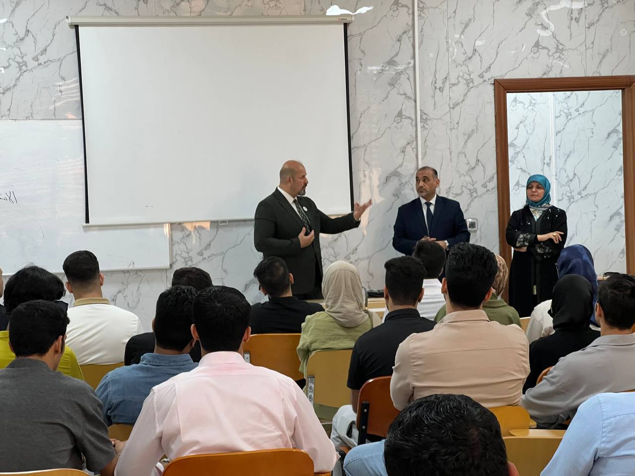 In the context of the College of Law Deanship's commitment to monitoring students and addressing their academic needs, the Dean of the College Asst. Prof. Dr. Khaled K. Odeh met with second - and third-year students on Monday, October 13, 2025, in the presence of several faculty members.