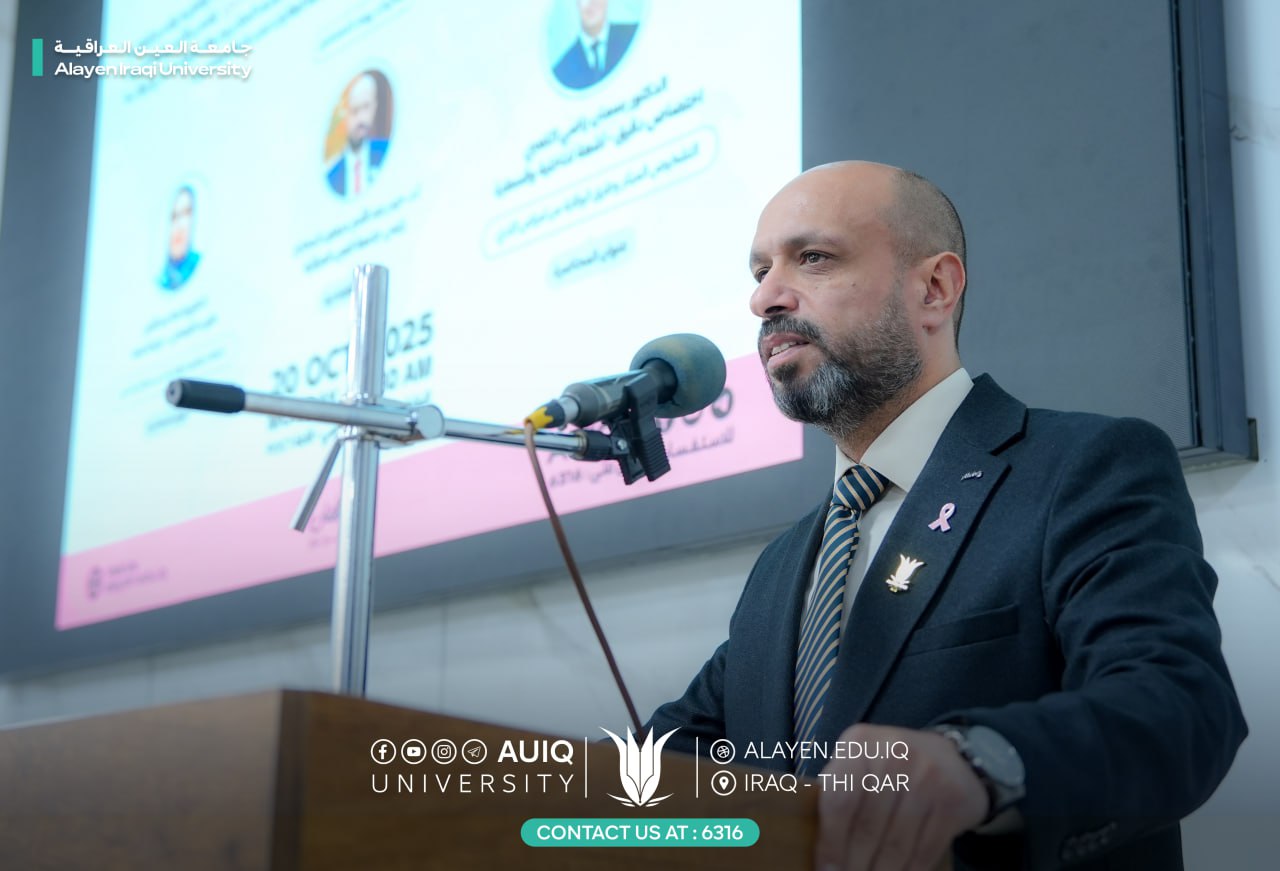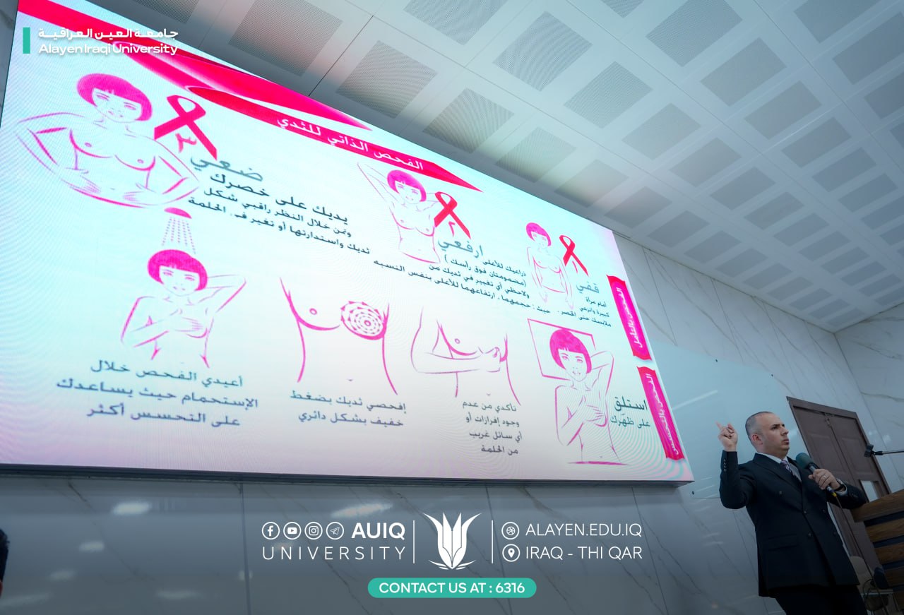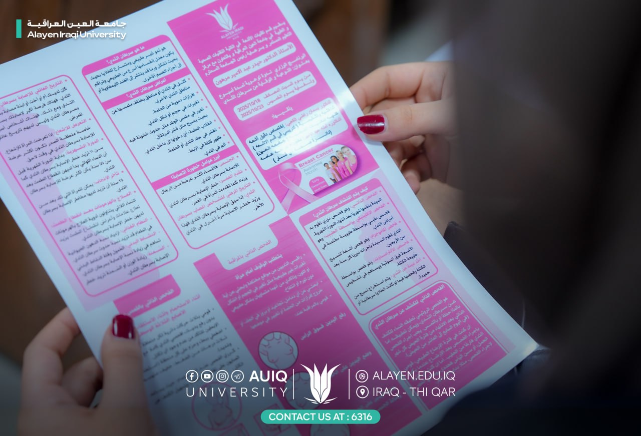 Under the patronage of the Chancellor of Al-Ayen University Prof. Dr. Haider A. Marhoon, the College of Medical Technology, inaugurated the first day of Breast Cancer Early Detection Week this morning, Monday, October 20, 2025. The event is organized by the Department of Radiology Technology at the college in cooperation with the Department of Continuing Education as part of the university's awareness activities for the month of Pink October.