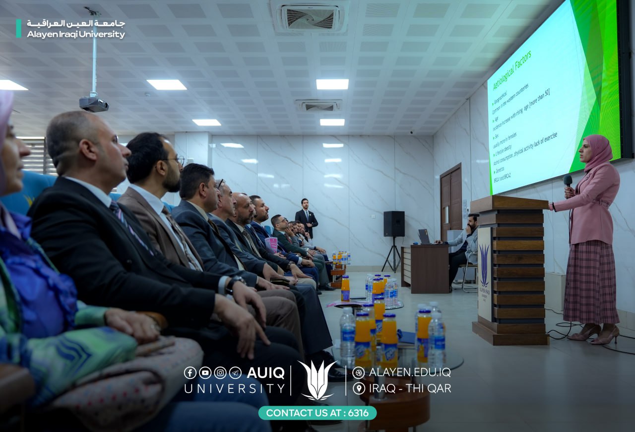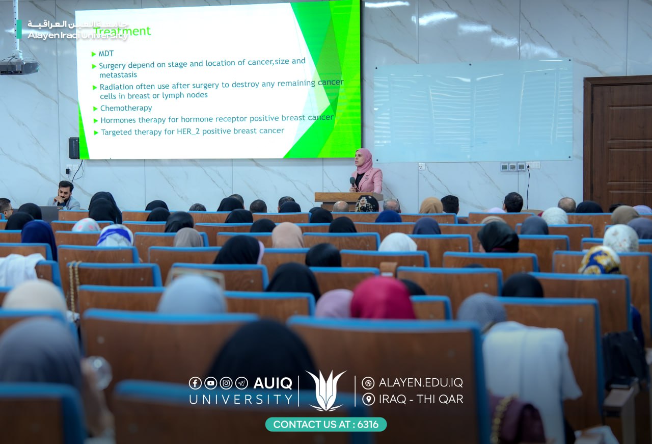 The second lecture, titled "Primary Preventive Measures for Breast Cancer," was presented by Dr. Amna Abdul Amir, a specialist in general surgery. She reviewed the causes of the disease, prevention methods, and the importance of regular self-examination for women.