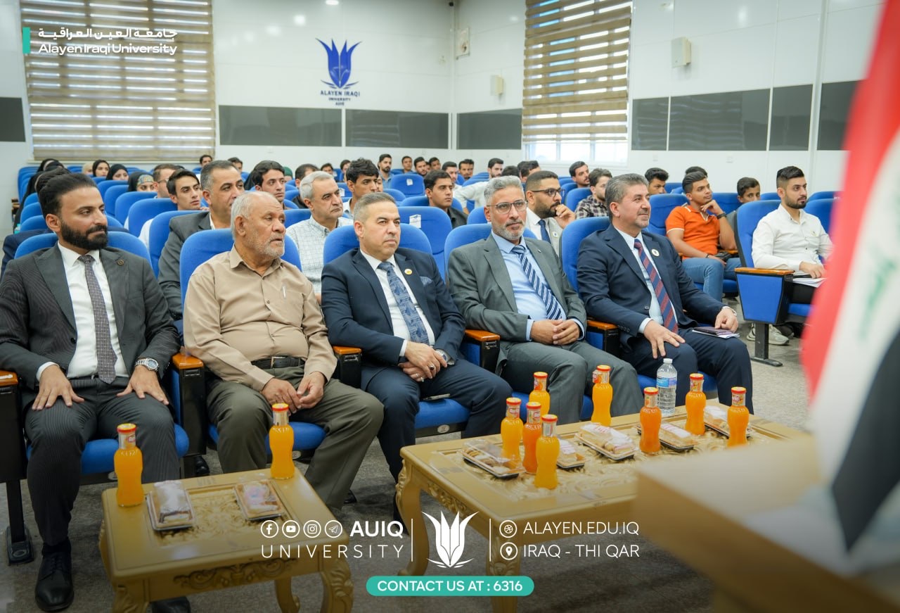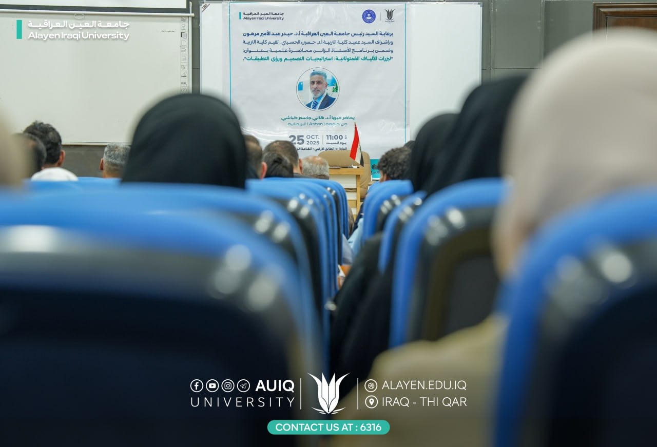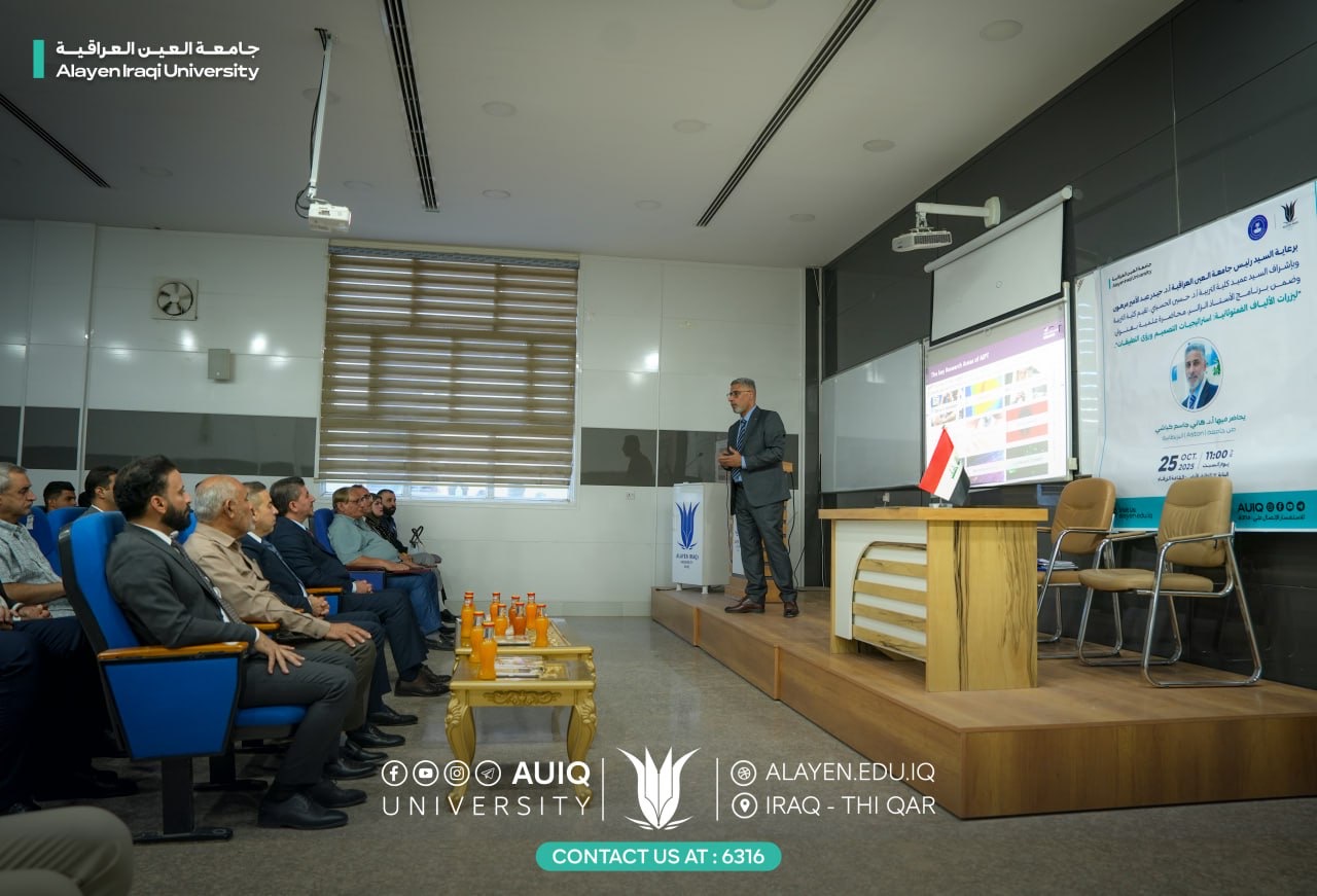 The lecture was attended by Prof. Dr. Imad A. Al-Mousawi Dean of the College of Education for Pure Sciences at the University of Dhi Qar, Dr. Adnan H. Al-Rikabi Deputy Dean for Scientific Affairs, Professor Muhammad Nazzal Deputy Dean for Student Affairs, Dr. Musa Muhammad Mahdi Head of the Physics Department and Dr. Faisal A. Awda Head of the Art Education Department at the College of Education at Al-Ayen Iraqi University, and a number of faculty members and students.