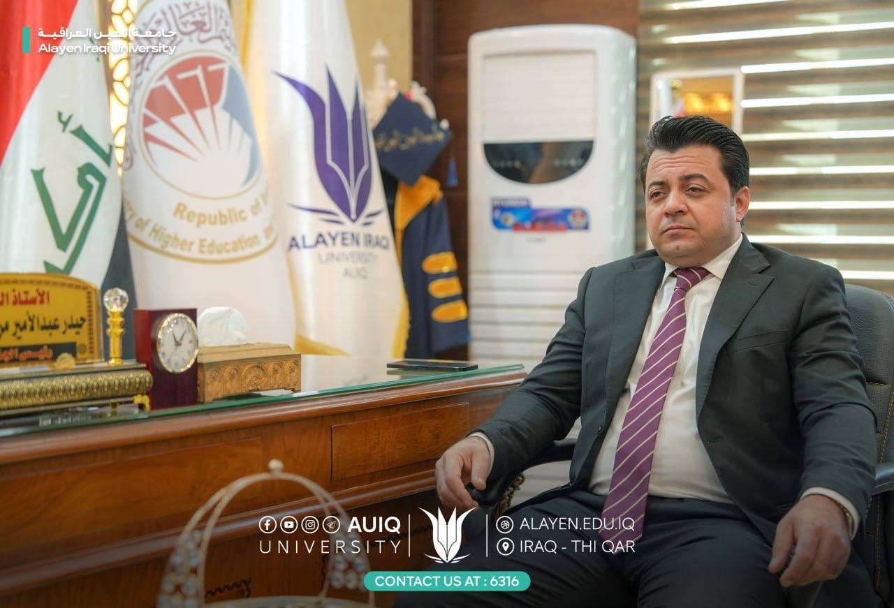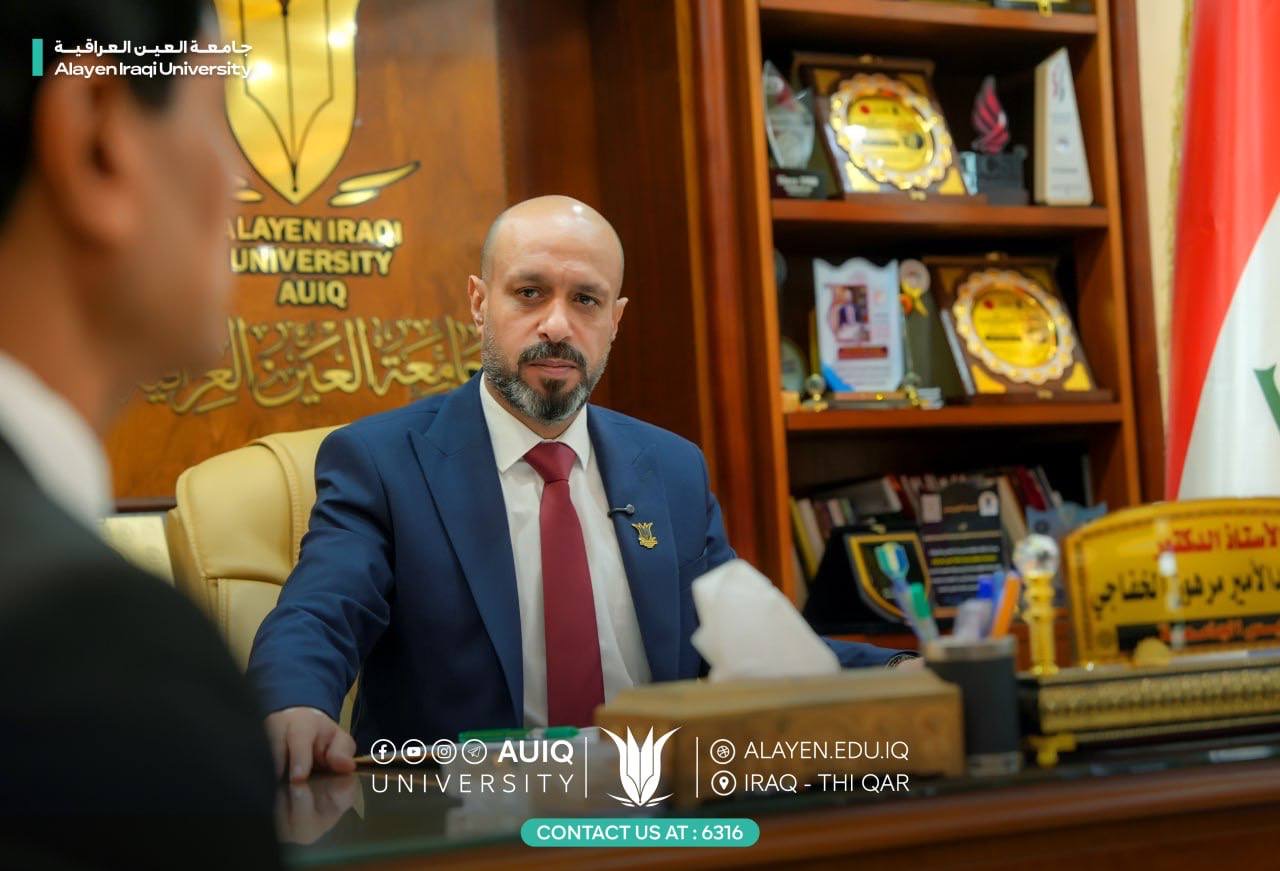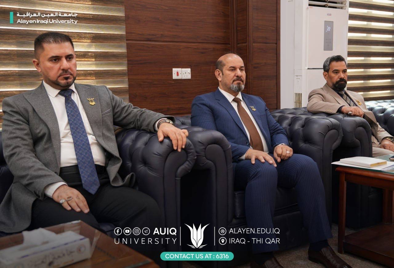 On November 3, 2025, the Chancellor of Al-Ayen Iraqi University, Prof. Dr. Haider A. Marhoon received a delegation from the Iraqi Department of Reformation, Ministry of Justice. The delegation, headed by the Director of the Department of Relations, Mr. Abbas Barisim Kitan, and accompanied by the Director of Nasiriyah Central Prison, Mr. Hussein Ahmed Abniya expressed their gratitude for the university's initiative to provide 50 free seats for inmates at Nasiriyah Central Prison.