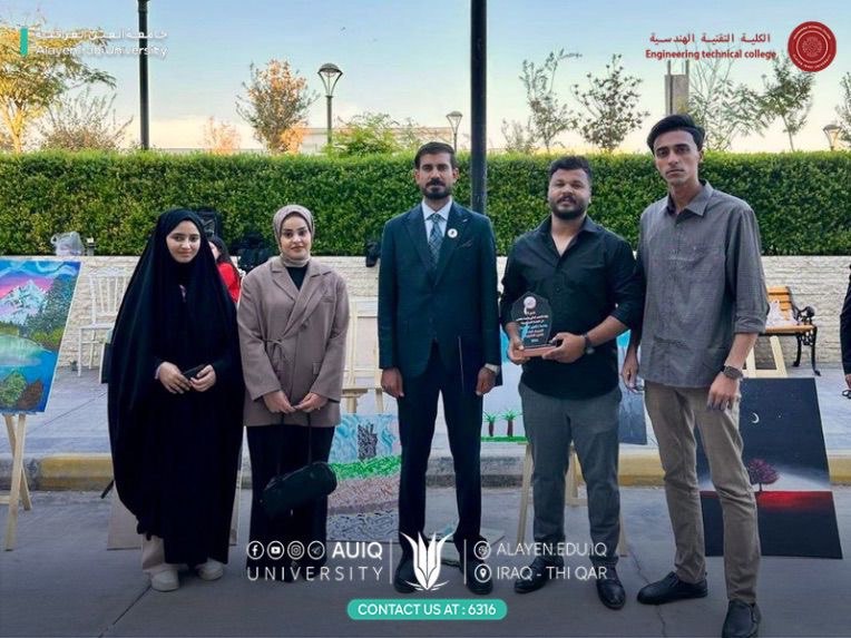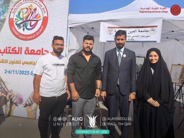 The College of Engineering Technology at Al-Ayen Iraqi University participated in the 2025 University Fine Arts Festival, held at Al-Kitab University, under the patronage of His Excellency the Minister of Higher Education and Scientific Research and supervised by the Ministry's Student Activities Department. Our college was represented at the festival by two students: Tahseen Jalil Sharif from the Medical Devices Department (fourth year) and Hussein Khalid from the Computer Technology Department (fourth year), both members of the college's cultural community. This participation focused on showcasing student artwork, promoting artistic creativity, and exchanging experiences with other universities.
