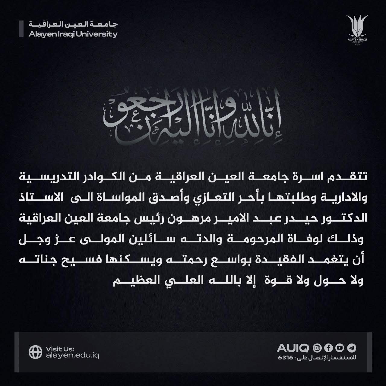 With profound sorrow and grief, the faculty, staff, and students of the College of Medicine at Al-Ayen Iraqi University extend their sincerest condolences and heartfelt sympathy to Prof. Dr. Haider A. Marhoon, Chancellor of Al-Ayen Iraqi University, on the passing of his mother, may God have mercy on her soul. We pray to God Almighty to grant her His abundant mercy, admit her to His spacious Paradise, and grant her family and loved ones patience and solace.