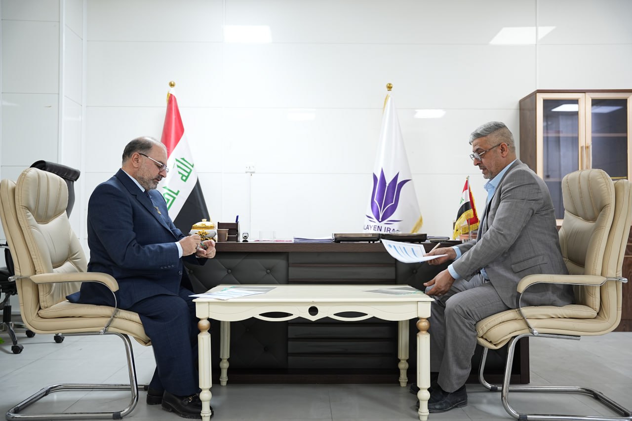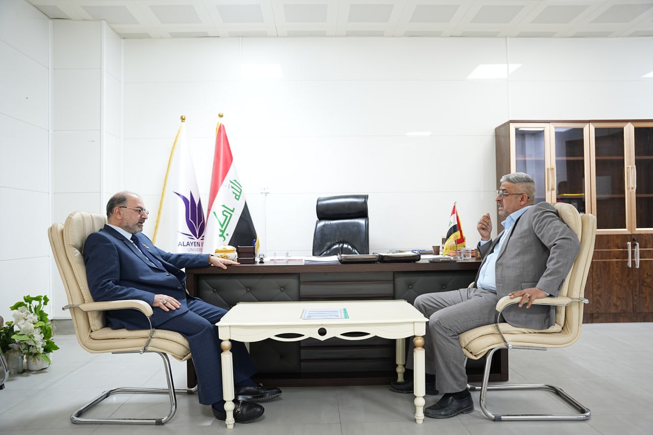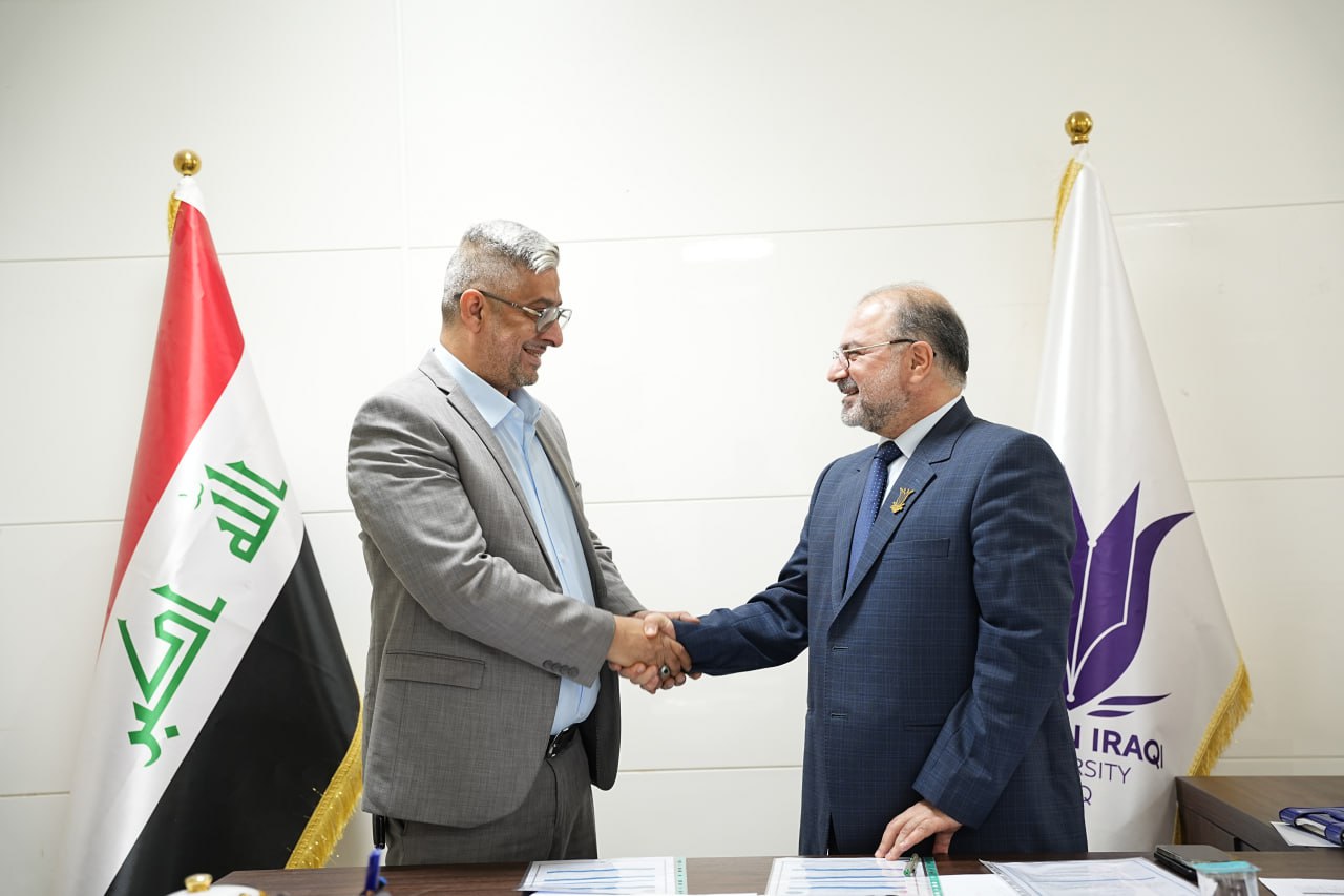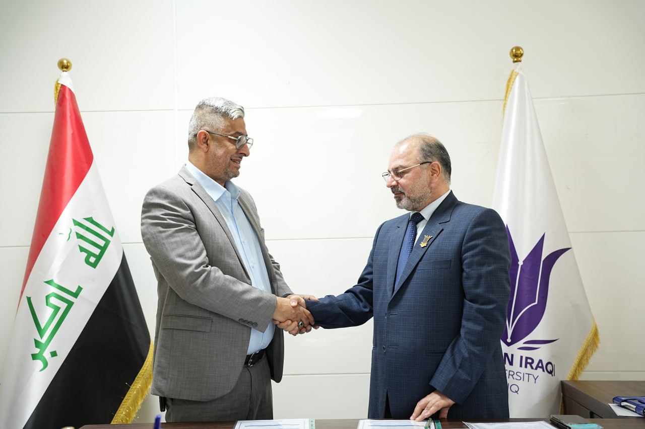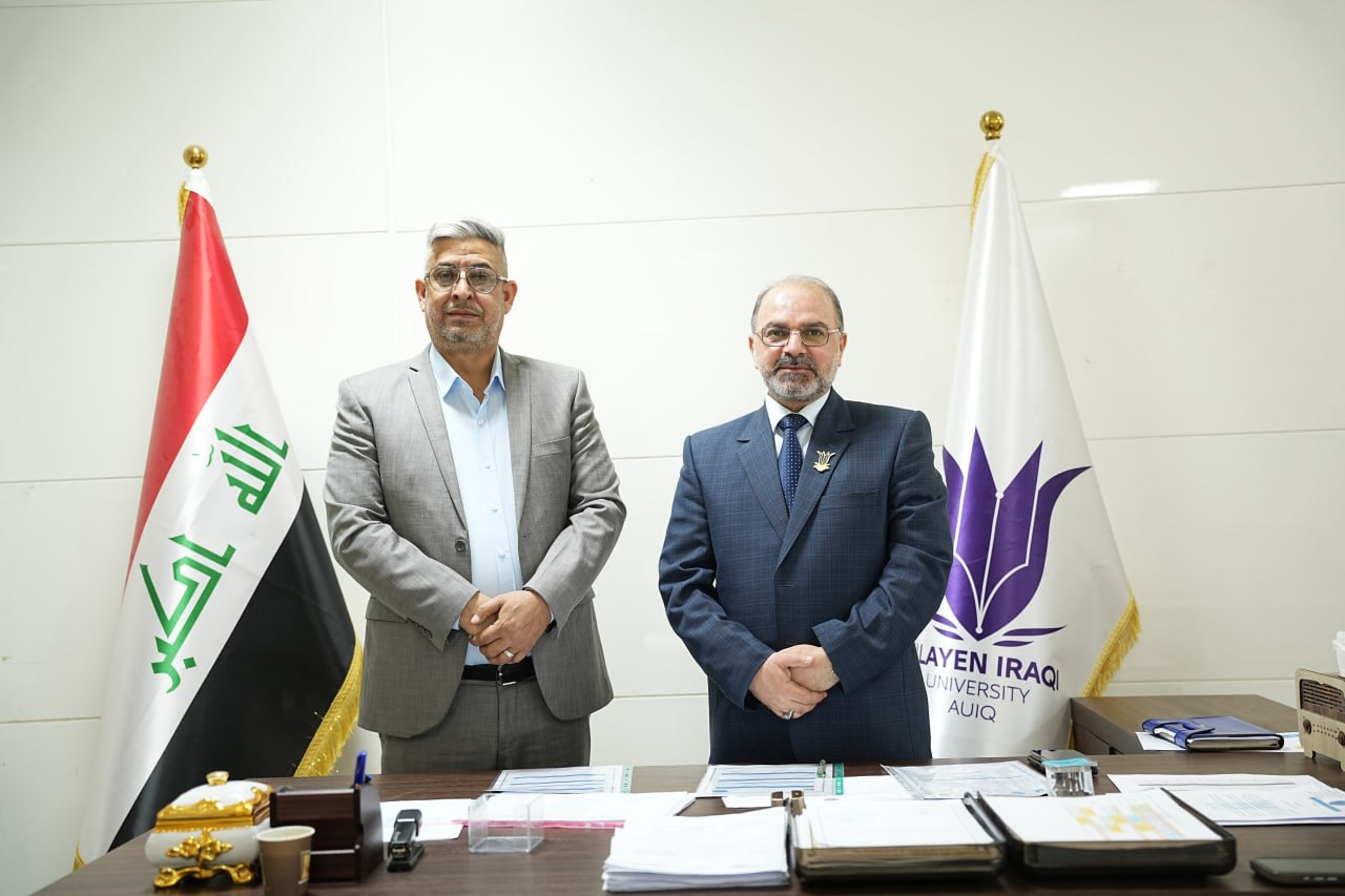 In its pursuit of strengthening the integration between academic education and professional practice, the College of Pharmacy at Al-Ayen Iraqi University signed a memorandum of understanding with the Pharmacists Syndicate in Dhi Qar on Sunday, December 7, 2025. The signing ceremony was attended by the Dean of the College, Dr. Haider Hamed Abbas Al-Anbari, and the Head of the Pharmacists Syndicate in Dhi Qar, Mr. Mohammed Sabah Kayzi.