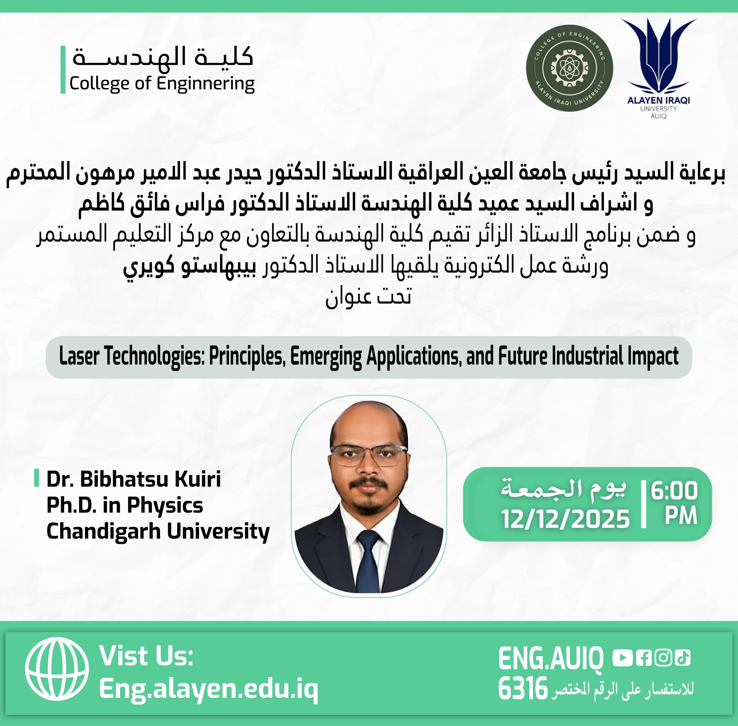 Under the patronage of the Chancellor of Al-Ayen University, Prof. Dr. Haider A. Marhoon, and the supervision of the Dean of the College, Prof. Dr. Firas F. Kadhim, the College of Engineering, in cooperation with the Continuing Education Center, announces an online workshop as part of the Visiting Professor Program entitled: Laser Technologies: Principles, Emerging Applications, and Future Industrial Impact.