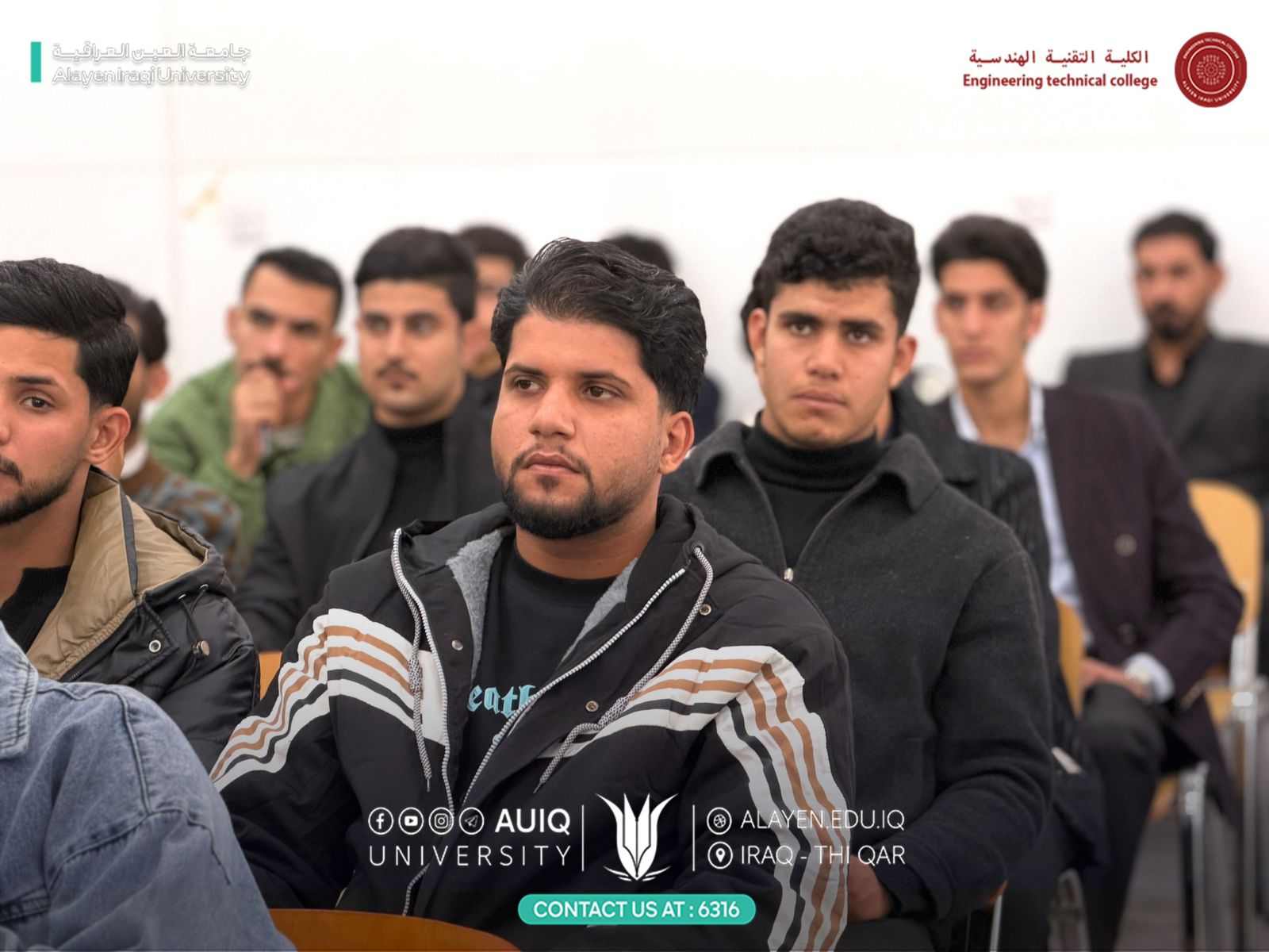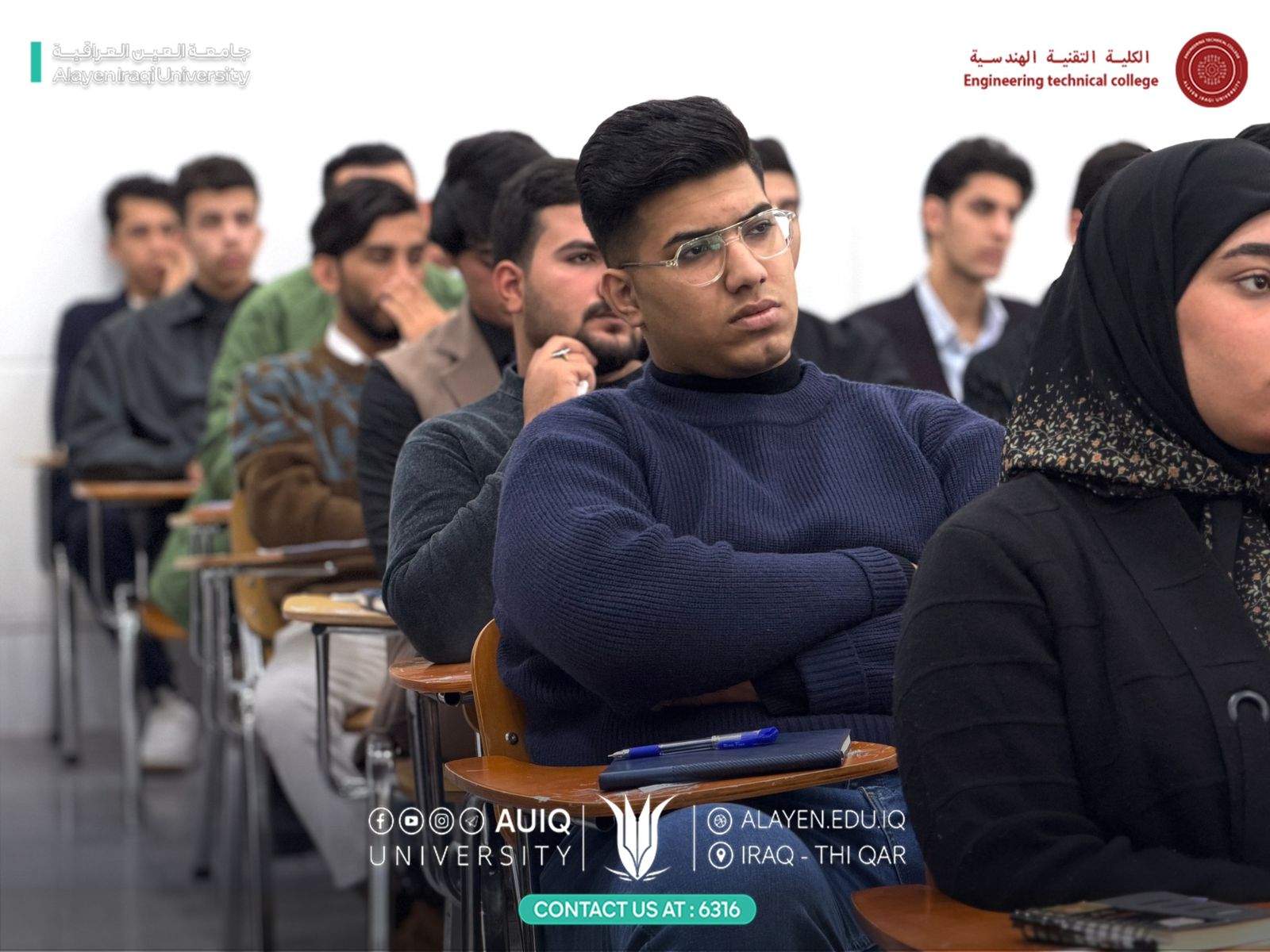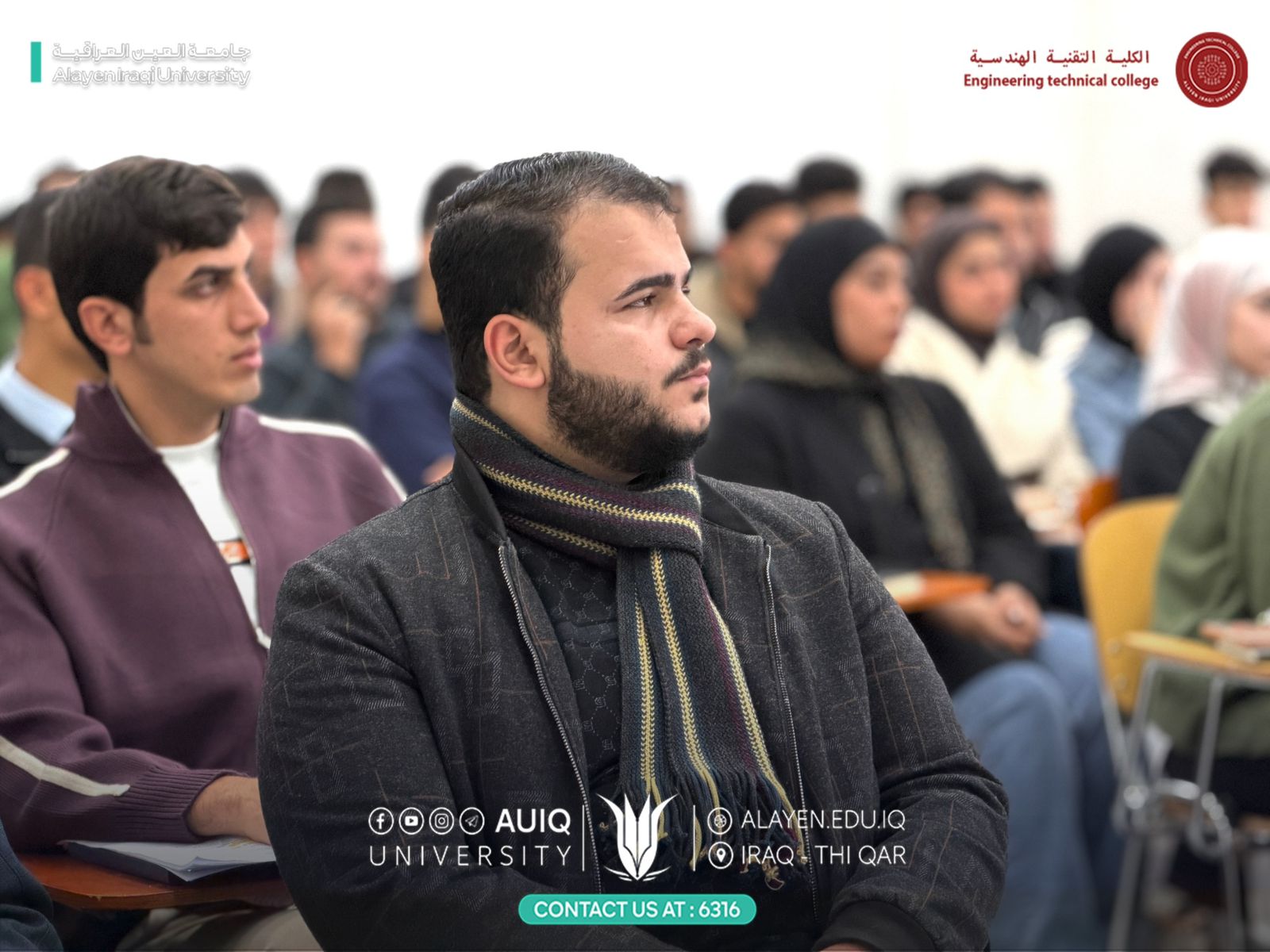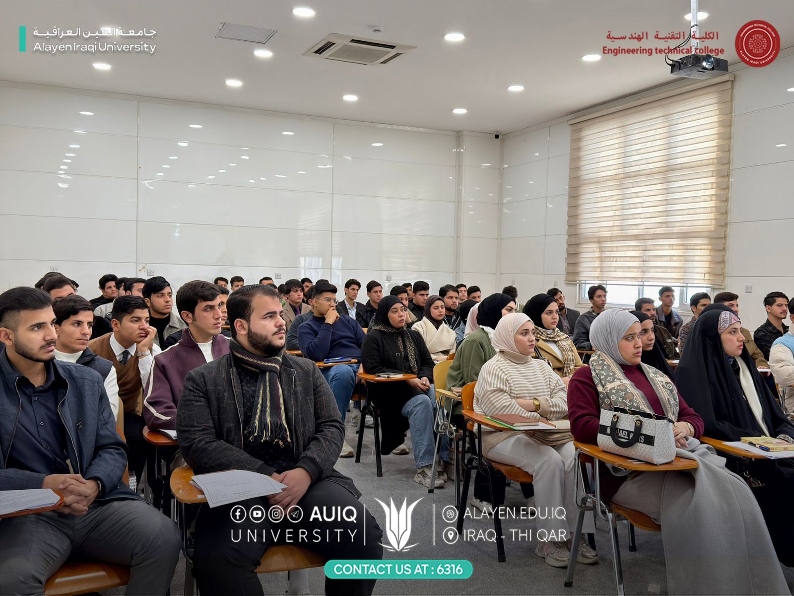 The College of Engineering Technology at Al-Ayen Iraqi University held a lecture titled "Academic Description of Courses in the Bologna Process" on the College's Central Committee for Institutional and Programmatic Accreditation. The lecture was delivered by Asst. Prof. Dr. Ahmed Najm Nimr, Head of the Fuel and Energy Engineering Technology Department and a member of the Central Committee, targeted first-year students in the Fuel and Energy Engineering Technology Department, aligning with the requirements of the Bologna Process.