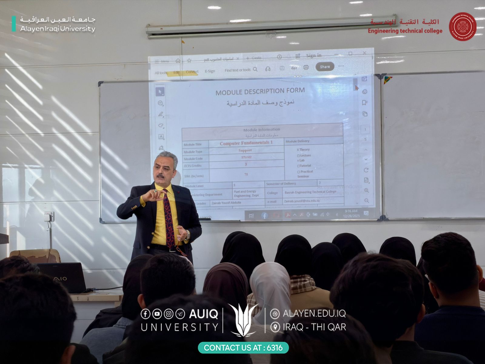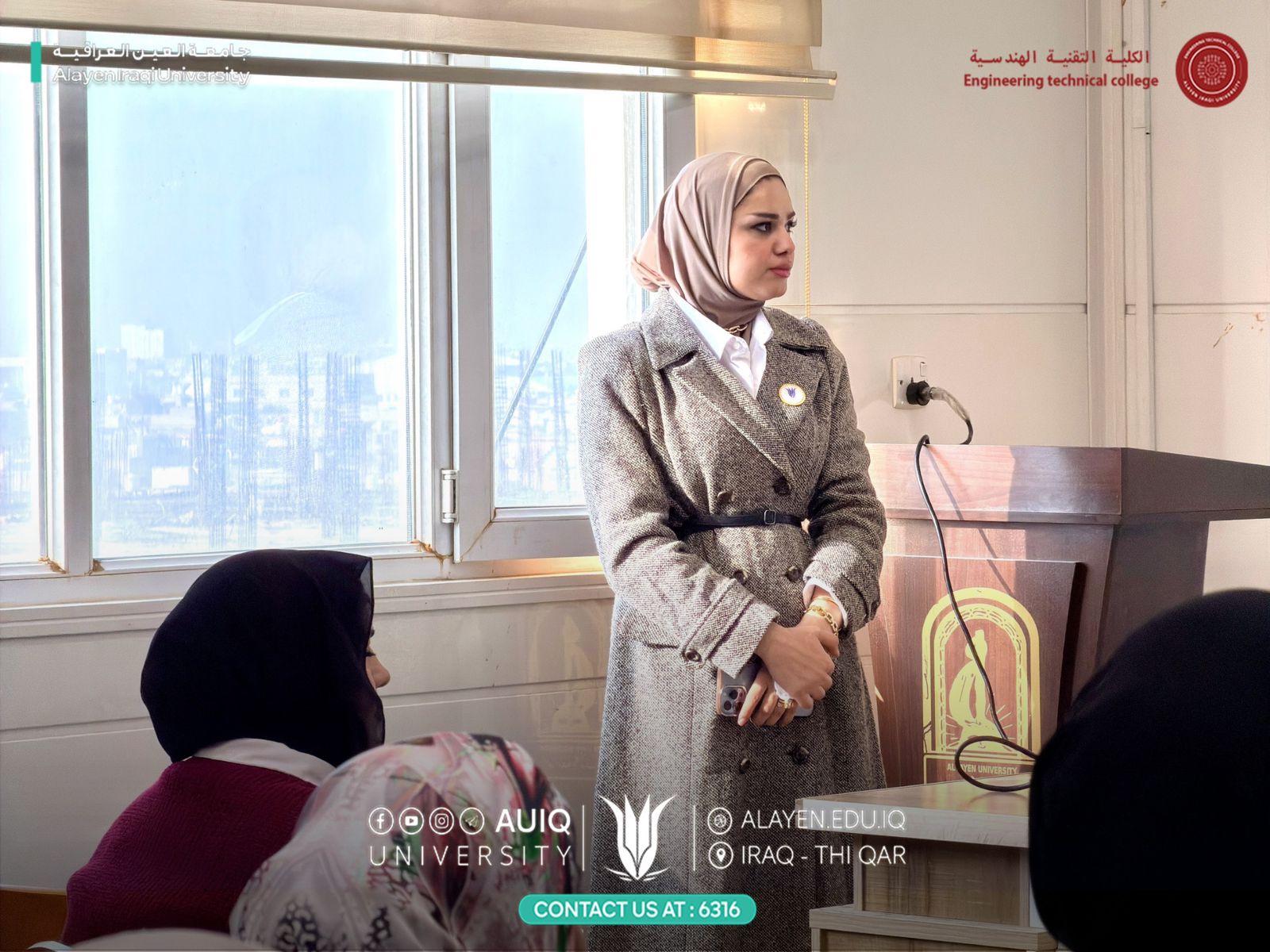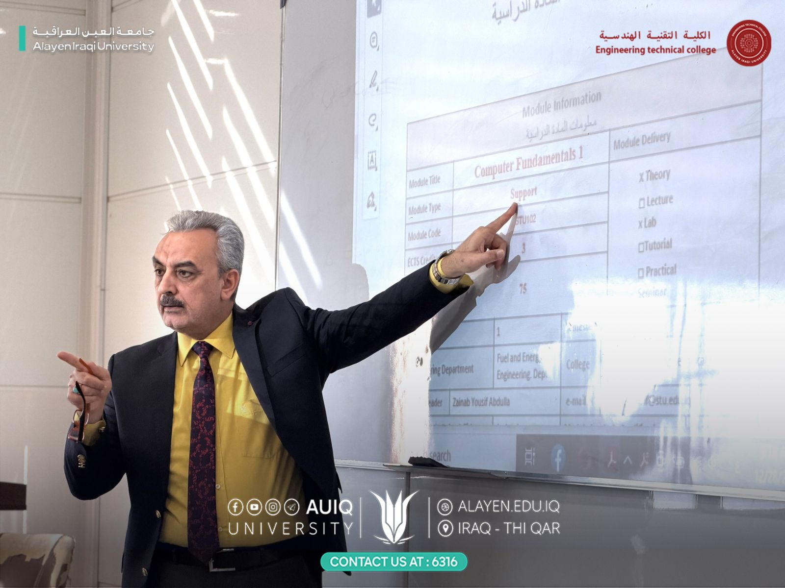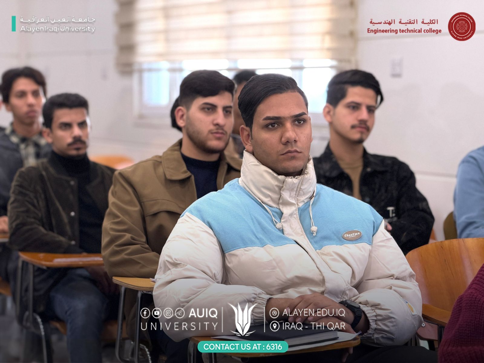 The College of Engineering Technology at Al-Ayen Iraqi University held a lecture titled "Academic Description of Courses in the Bologna Process" on the College's Central Committee for Institutional and Programmatic Accreditation. The lecture was delivered by Asst. Prof. Dr. Ahmed Najm Nimr, Head of the Fuel and Energy Engineering Technology Department and a member of the Central Committee, targeted first-year students in the Fuel and Energy Engineering Technology Department, aligning with the requirements of the Bologna Process.