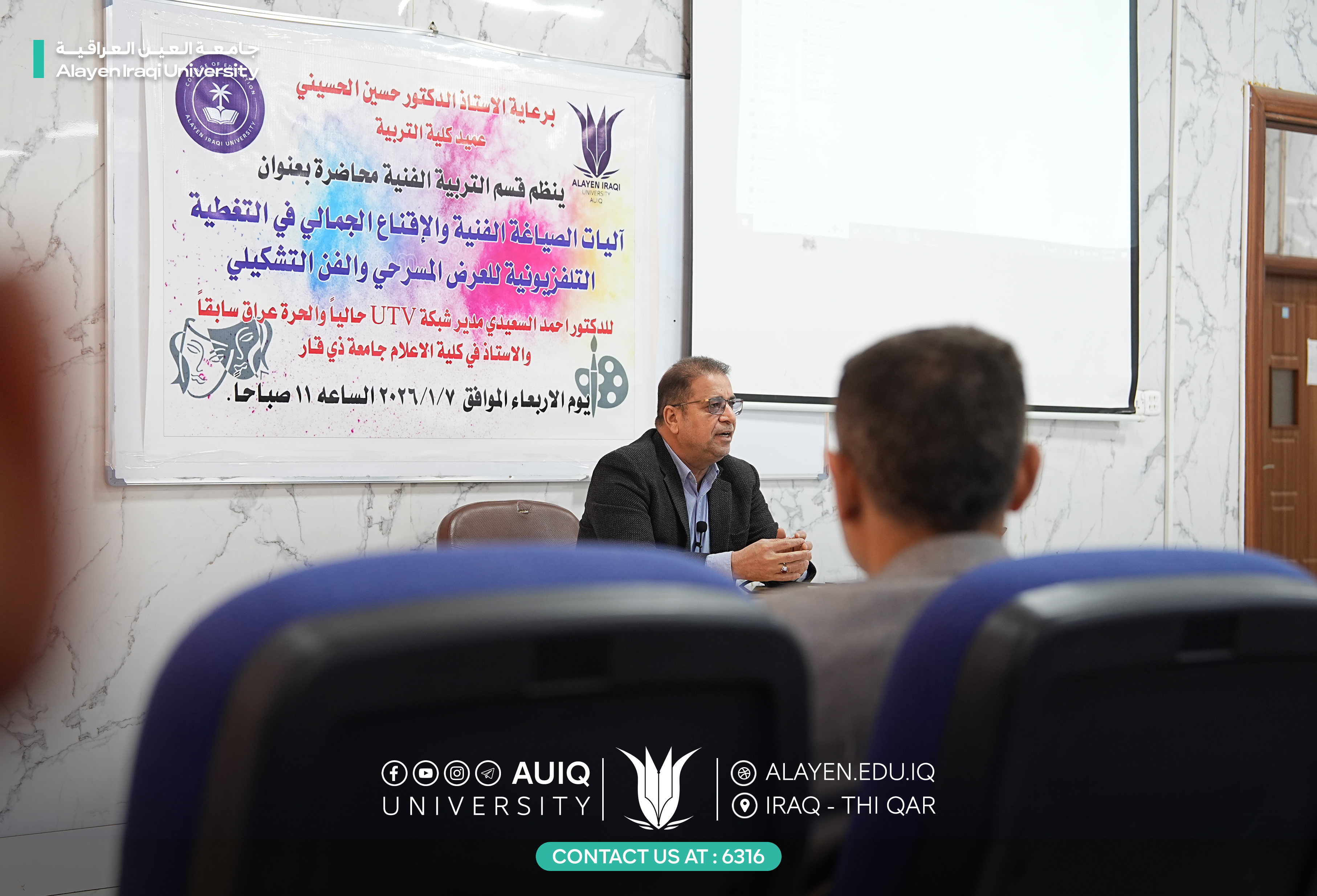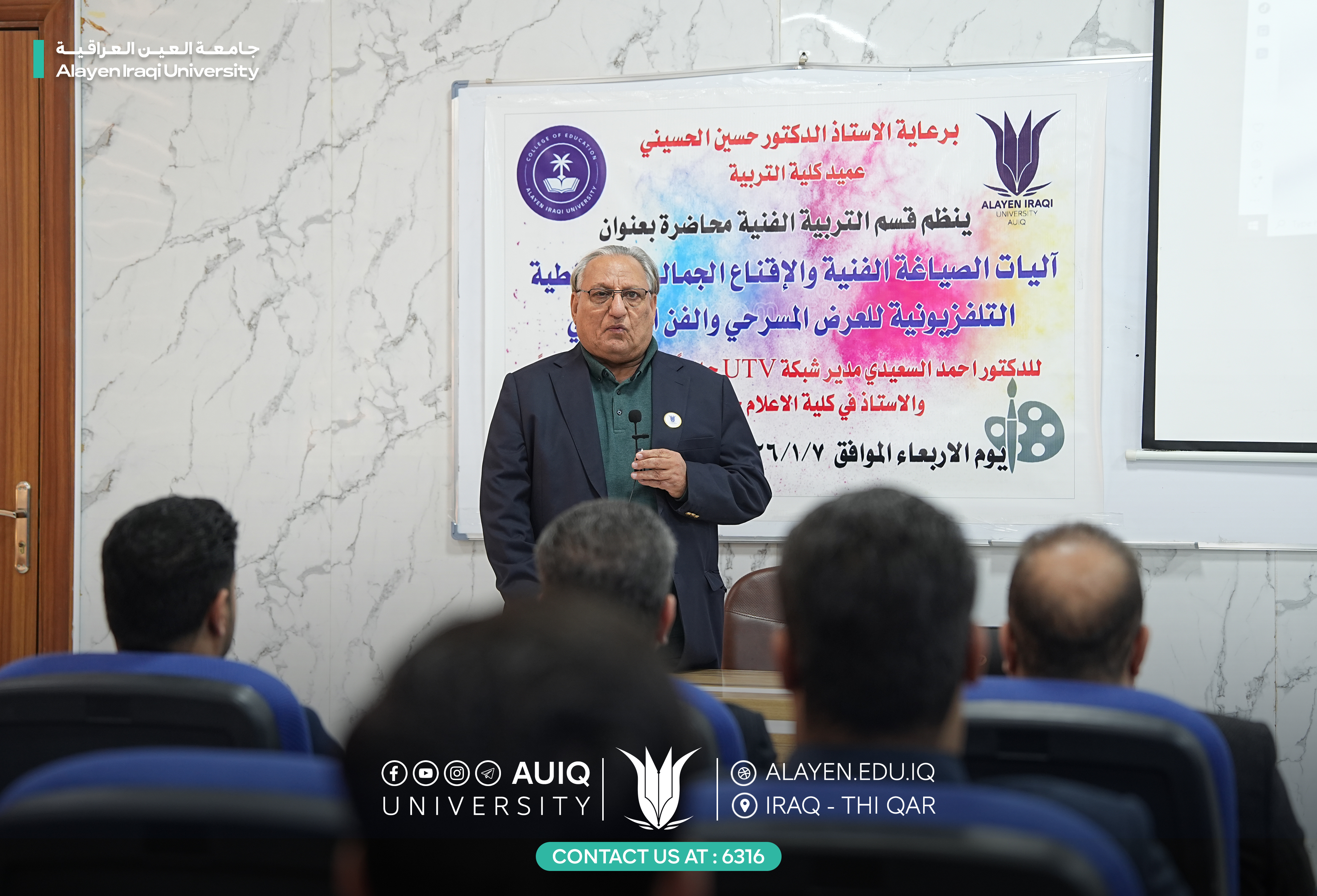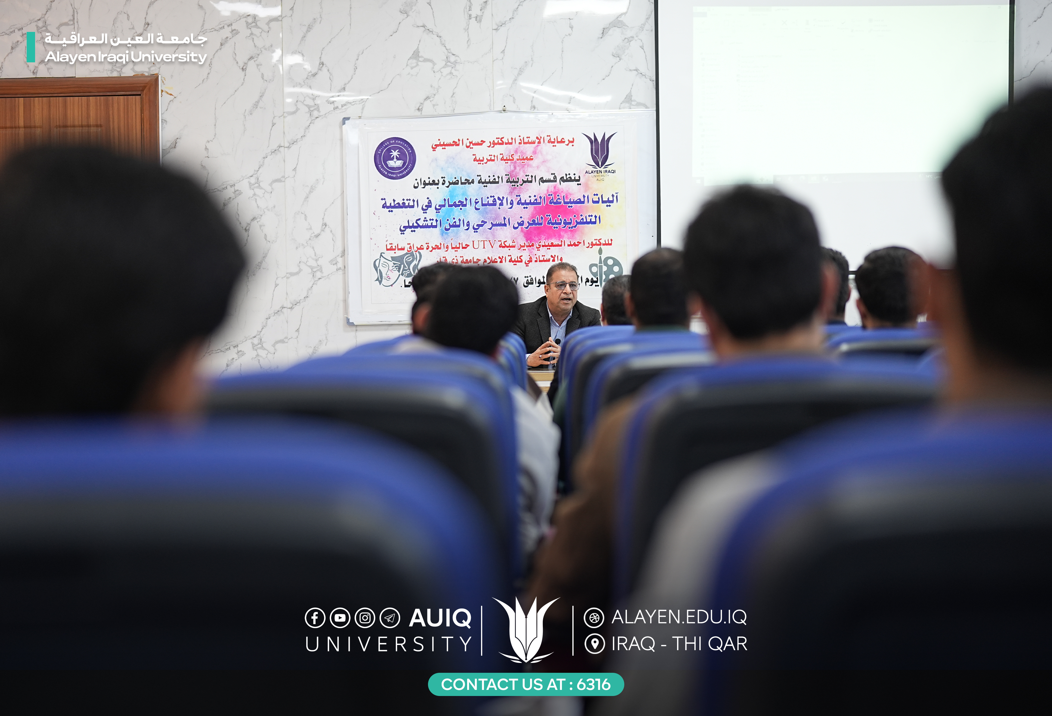 The Department of Art Education at the College of Education, in cooperation with the Department of Media at Al-Ayen Iraqi University, organized a lecture entitled "Mechanisms of Artistic Composition and Aesthetic Persuasion in Television Coverage of Theatrical Performances and Fine Art." The lecture was attended by Prof. Dr. Ahmed Al-Saidi, current director of UTV, former director of Al-Hurriya Iraq Channel, and professor of media at the College of Media, University of Dhi Qar.