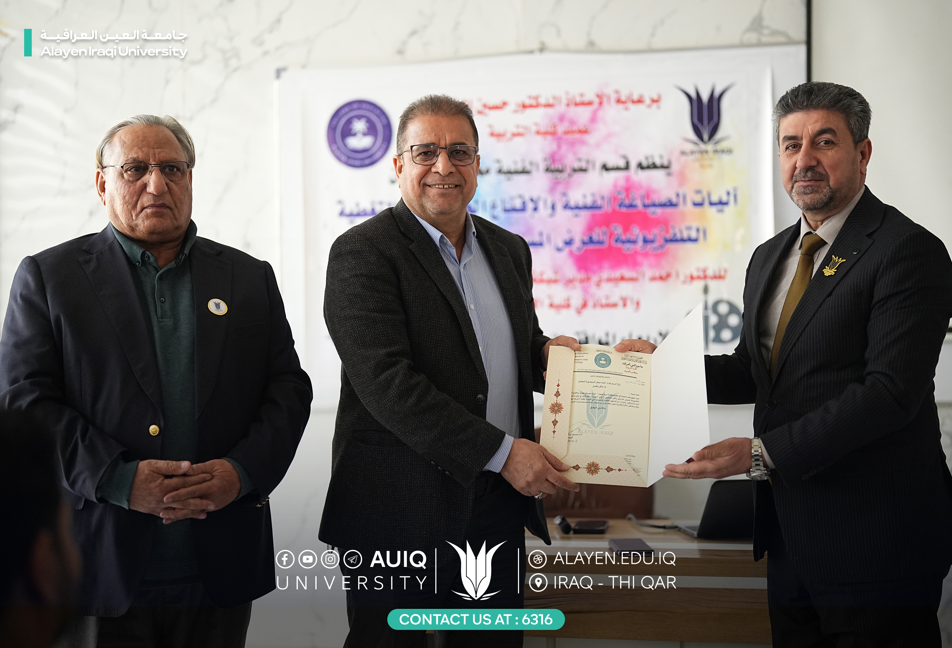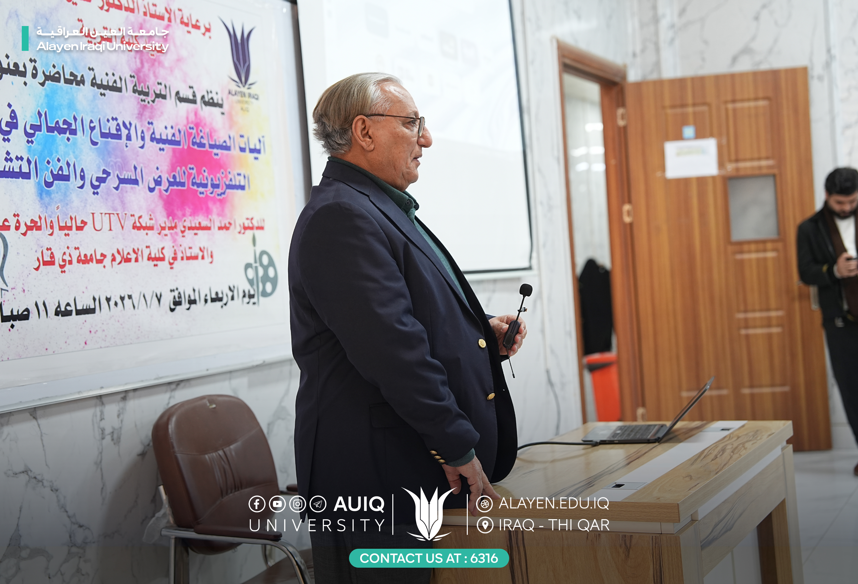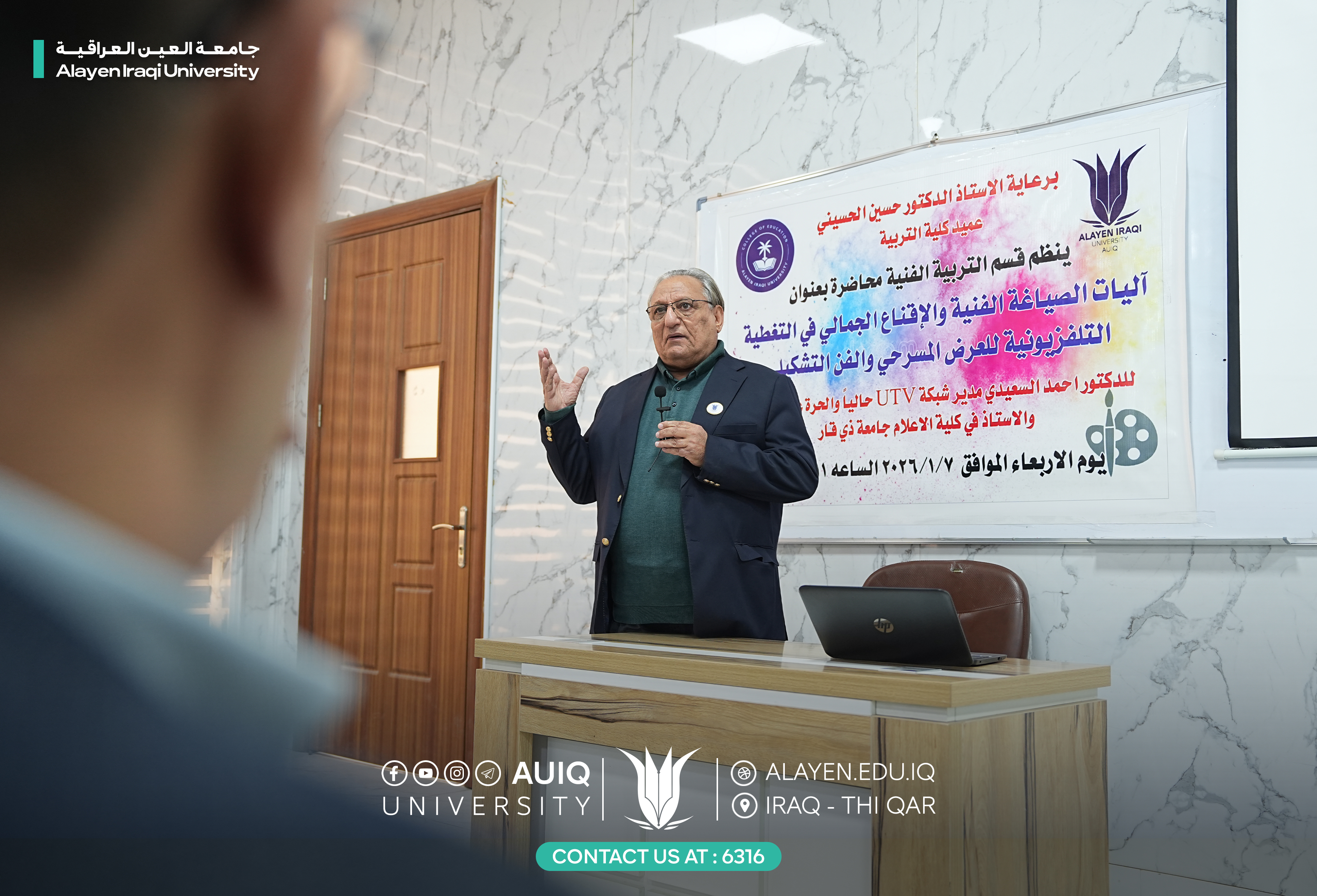 The Department of Art Education at the College of Education, in cooperation with the Department of Media at Al-Ayen Iraqi University, organized a lecture entitled "Mechanisms of Artistic Composition and Aesthetic Persuasion in Television Coverage of Theatrical Performances and Fine Art." The lecture was attended by Prof. Dr. Ahmed Al-Saidi, current director of UTV, former director of Al-Hurriya Iraq Channel, and professor of media at the College of Media, University of Dhi Qar.
