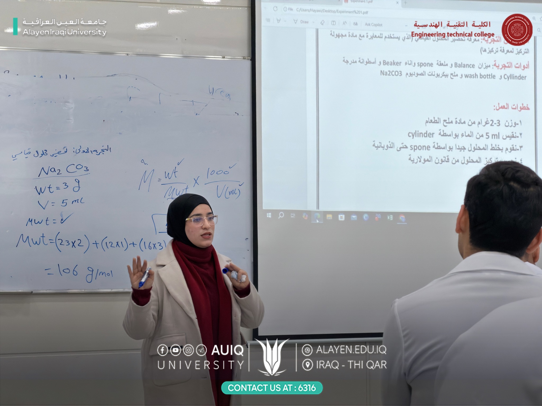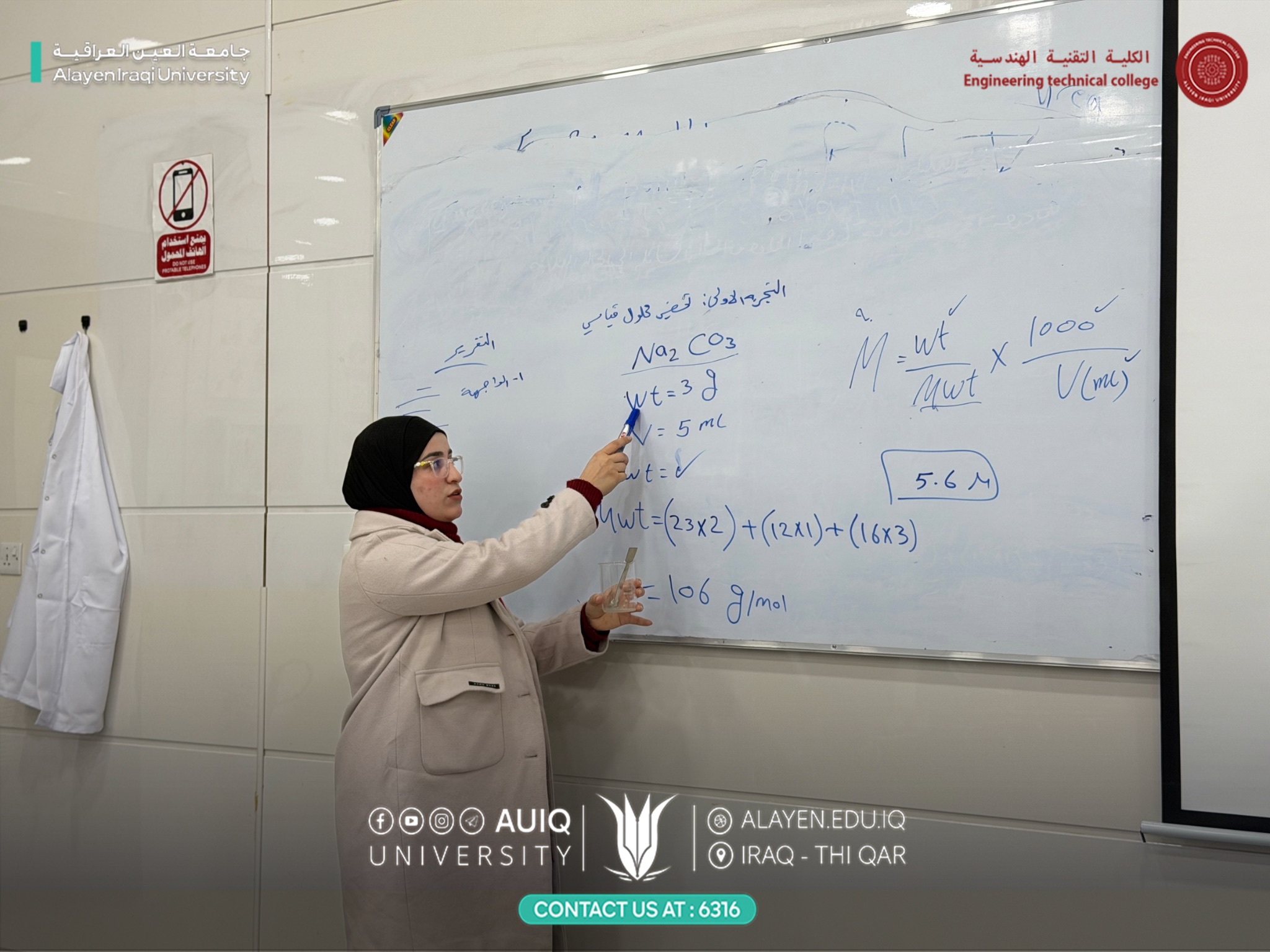 The experiment included a detailed practical demonstration of the steps involved in preparing the standard solution, presented by the course teaching assistant, Ms. Ahoud Jawad. The demonstration covered the precise weighing process, dissolution, the use of a volumetric flask, and the importance of controlling the concentration to obtain accurate analytical results. Safety protocols and proper laboratory procedures were also emphasized.