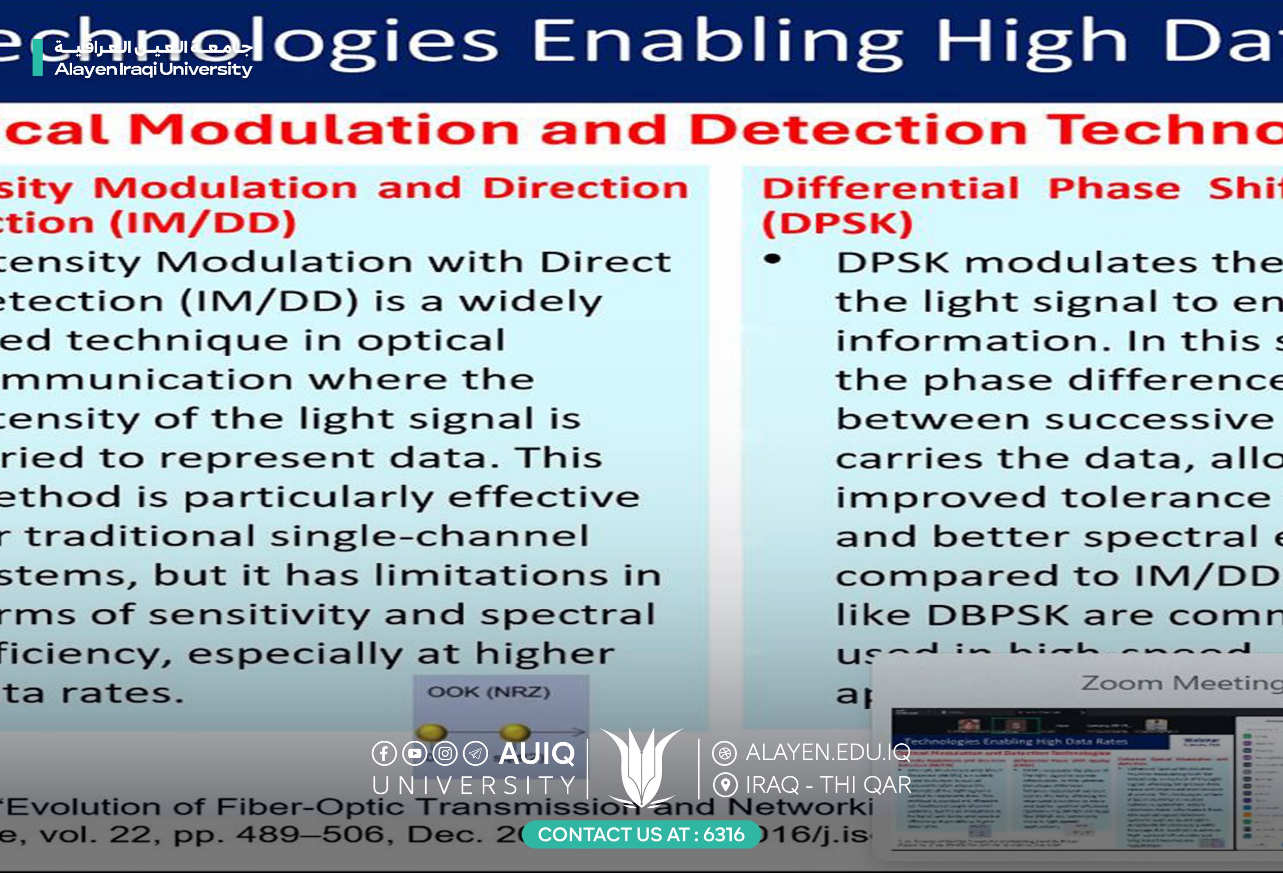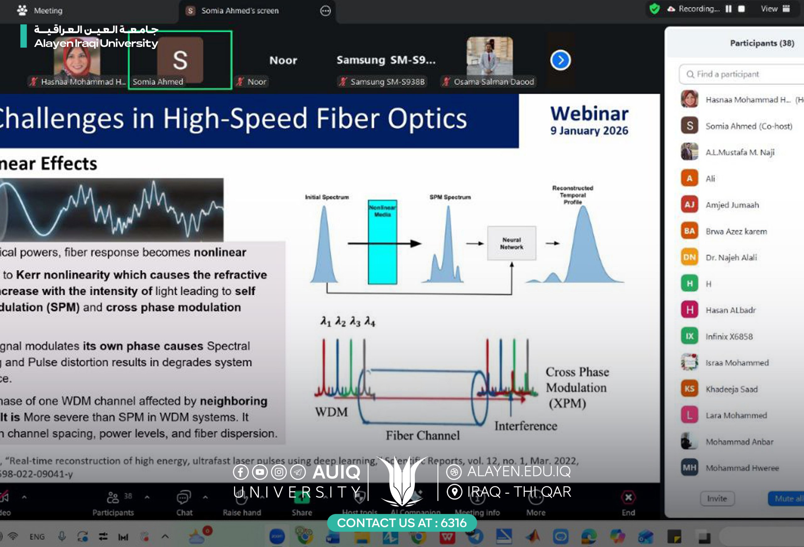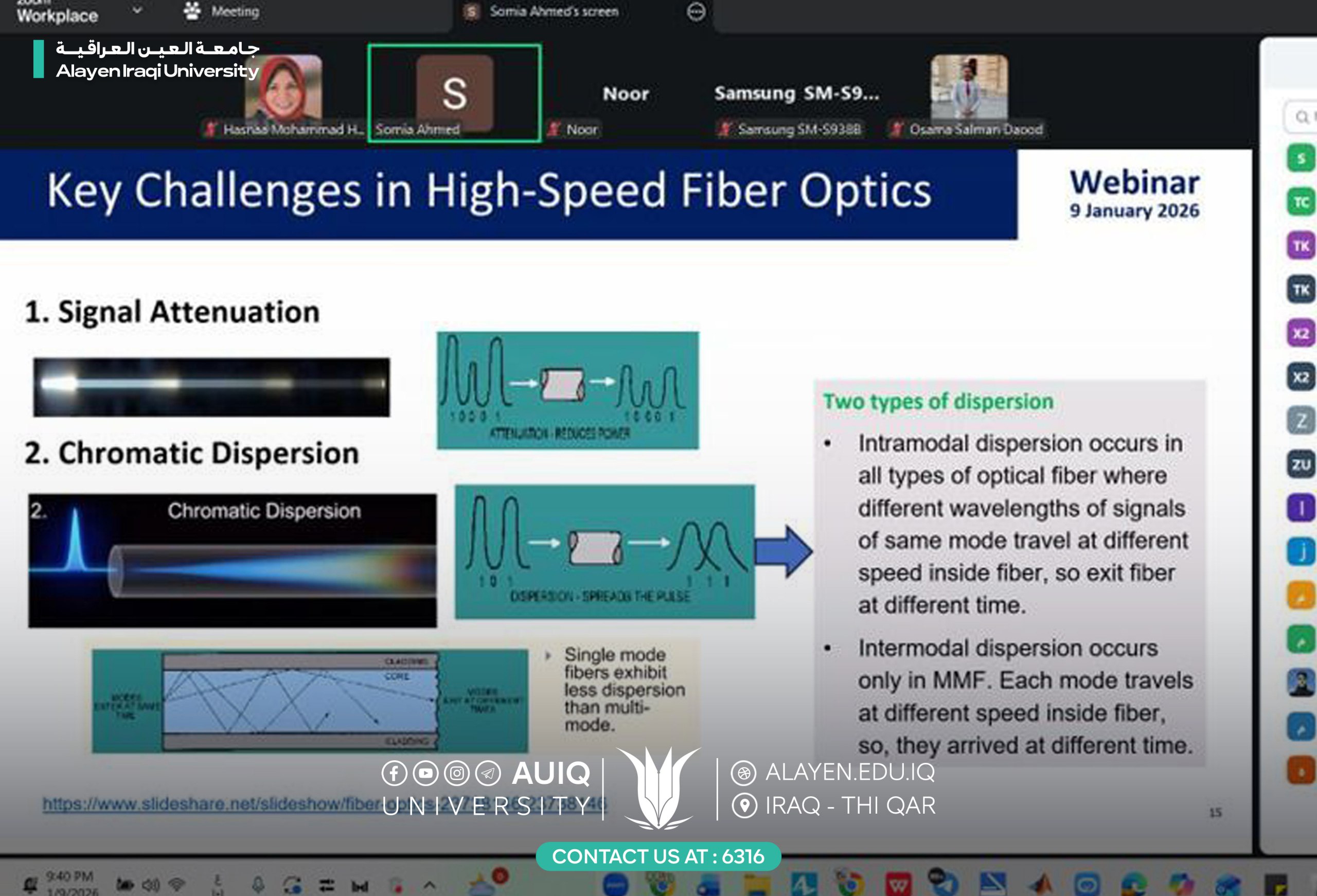 "Fiber Optics for High-Capacity Communication: Technology, Challenges, and Solutions," It was presented by Dr. Sumaya Ahmed, who holds a PhD. in Electrical Engineering from Alexandria University. Dr. Ahmed addressed specialized scientific topics focusing on recent advancements in fiber optic technologies and their strategic role in building high-capacity and efficient communication systems. She also reviewed the technical and engineering challenges facing practical applications and discussed internationally recognized advanced solutions for enhancing network reliability and improving data transmission efficiency.