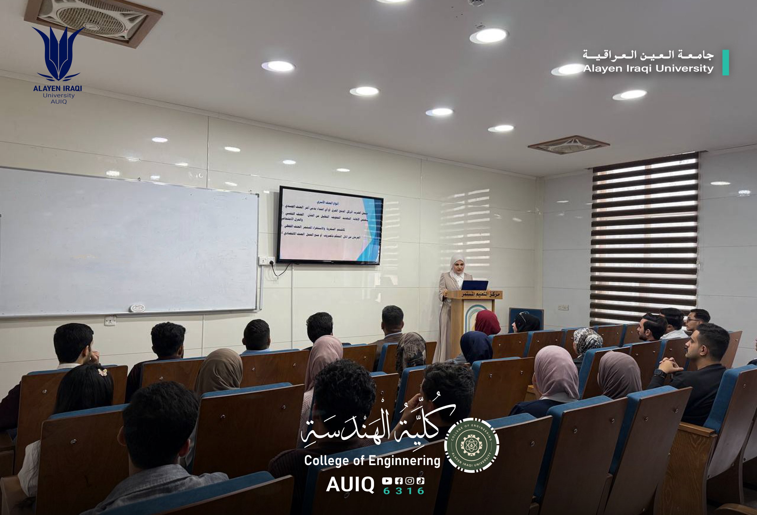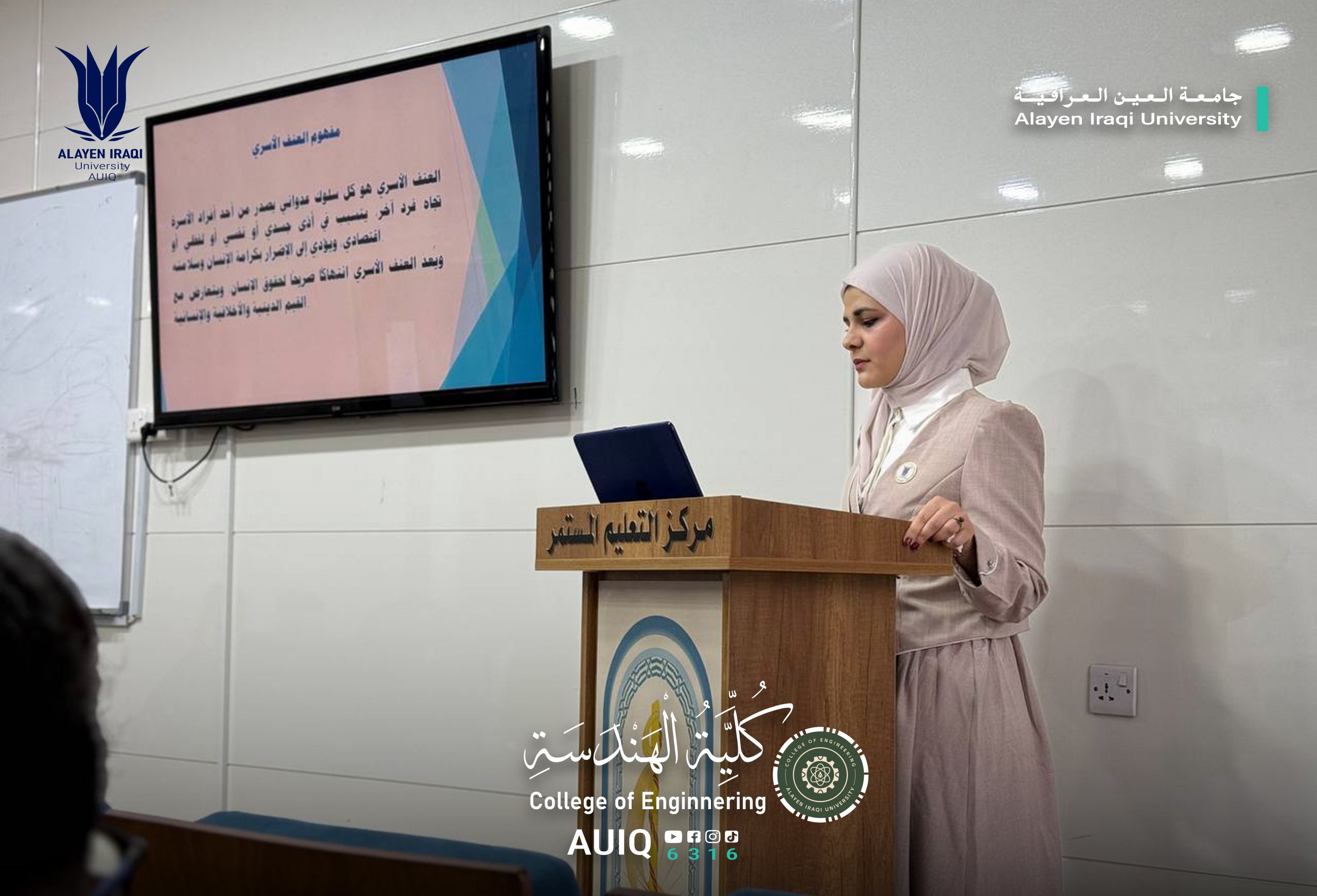 In an attempt to achieve the Sustainable Development Goals and to enhance the role of academic institutions in serving the community and disseminate awareness of human rights, the College of Engineering at Al-Ayen Iraqi University, in cooperation with women's rights organizations, held an awareness workshop entitled "The Impact of Violence on the Family and its Psychological and Social Repercussions." The workshop was presented by Asst. Lecturer Sara Mohammed Abdul Khader and attended by a number of faculty members and students.