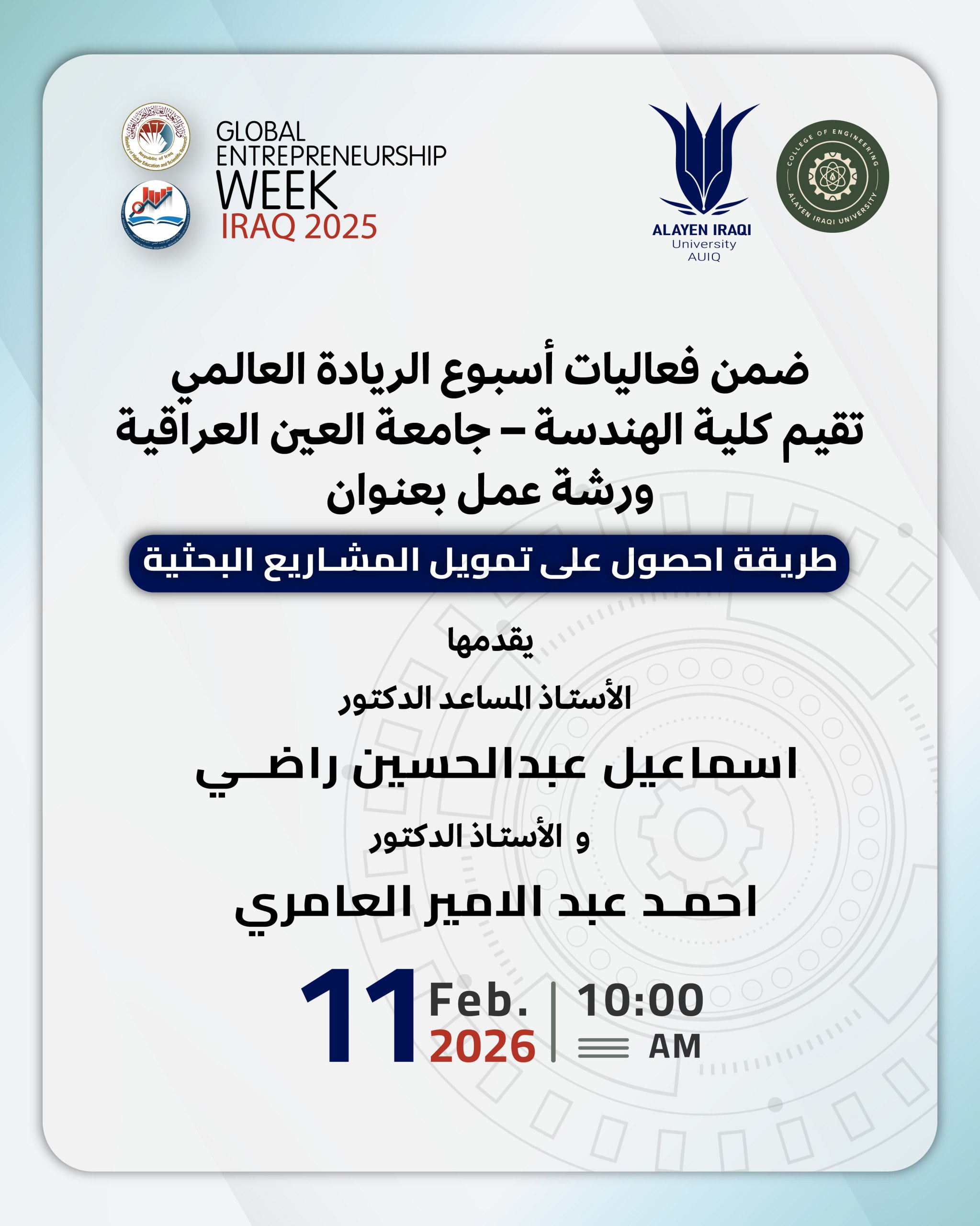 As part of Global Entrepreneurship Week, the College of Engineering at Al-Ayen Iraqi University held a workshop titled "How to Obtain Funding for Research Projects" on February 11, 2026.