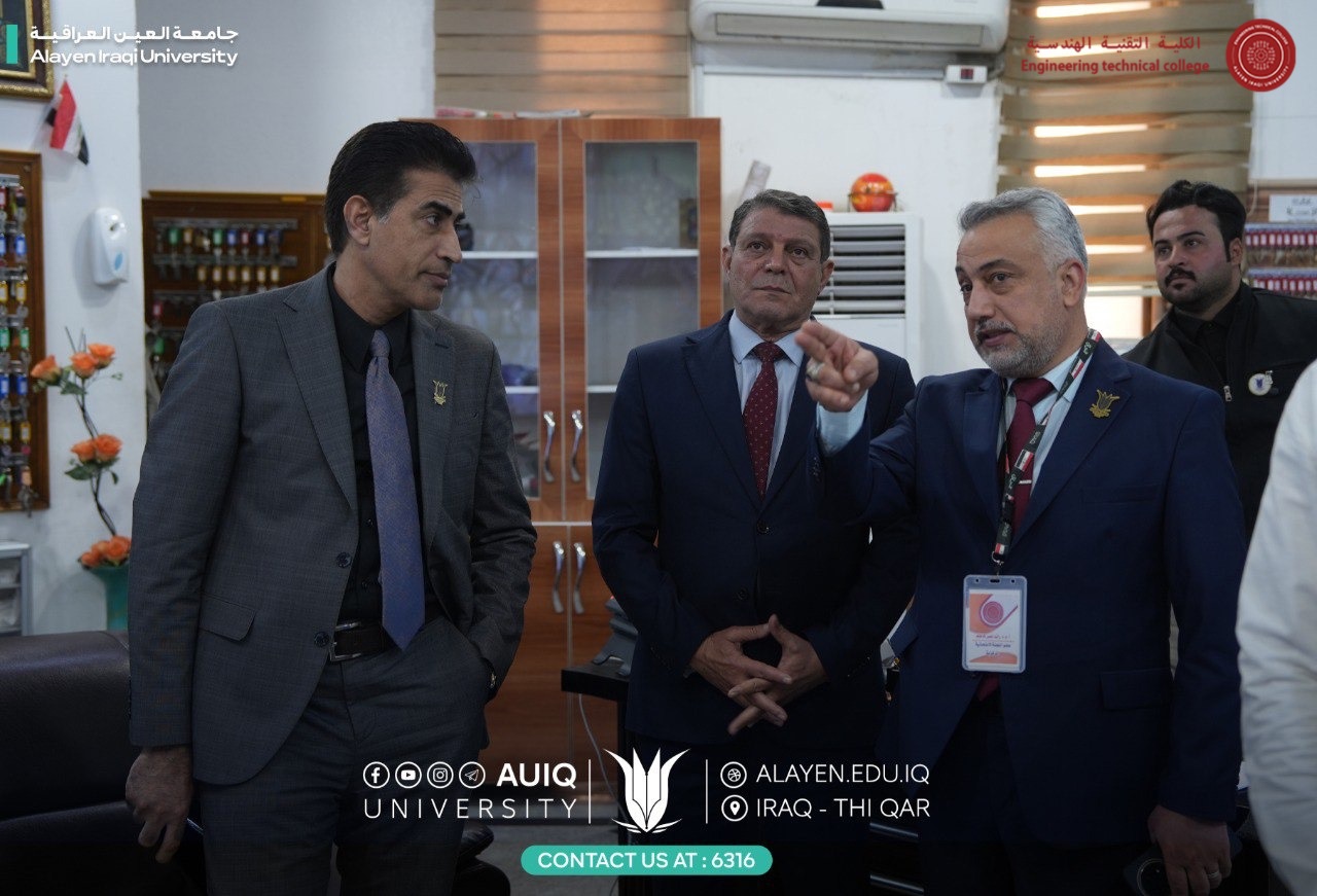 The Dean of the College of Dentistry, Prof. Dr. Ihsan A. Kamil, on behalf of the University Chancellor, conducted an inspection tour accompanied by the Dean of the College of Engineering Technology Asst. Prof. Dr. Rafid S. Al-Jubouri, on behalf of the University Chancellor's Academic Deputy, and the Deputy Dean for Acedemic Affairs at the College of Engineering Technology, Asst. Prof. Dr. Raed N. Al-Obaidi. The College of Engineering Technology was among the first colleges monitored, underscoring its active role and distinguished academic standing.