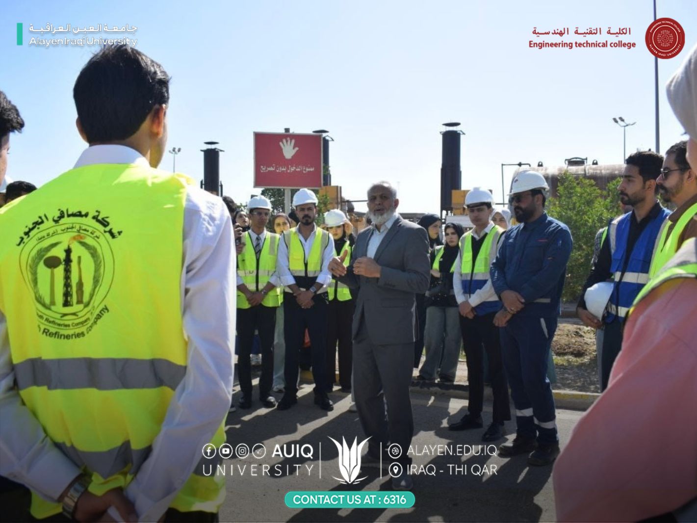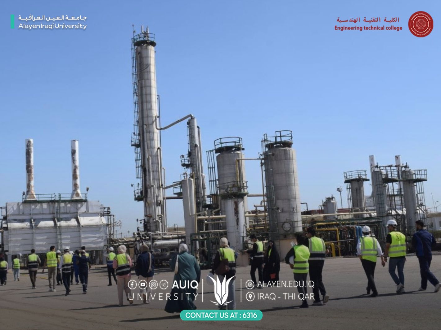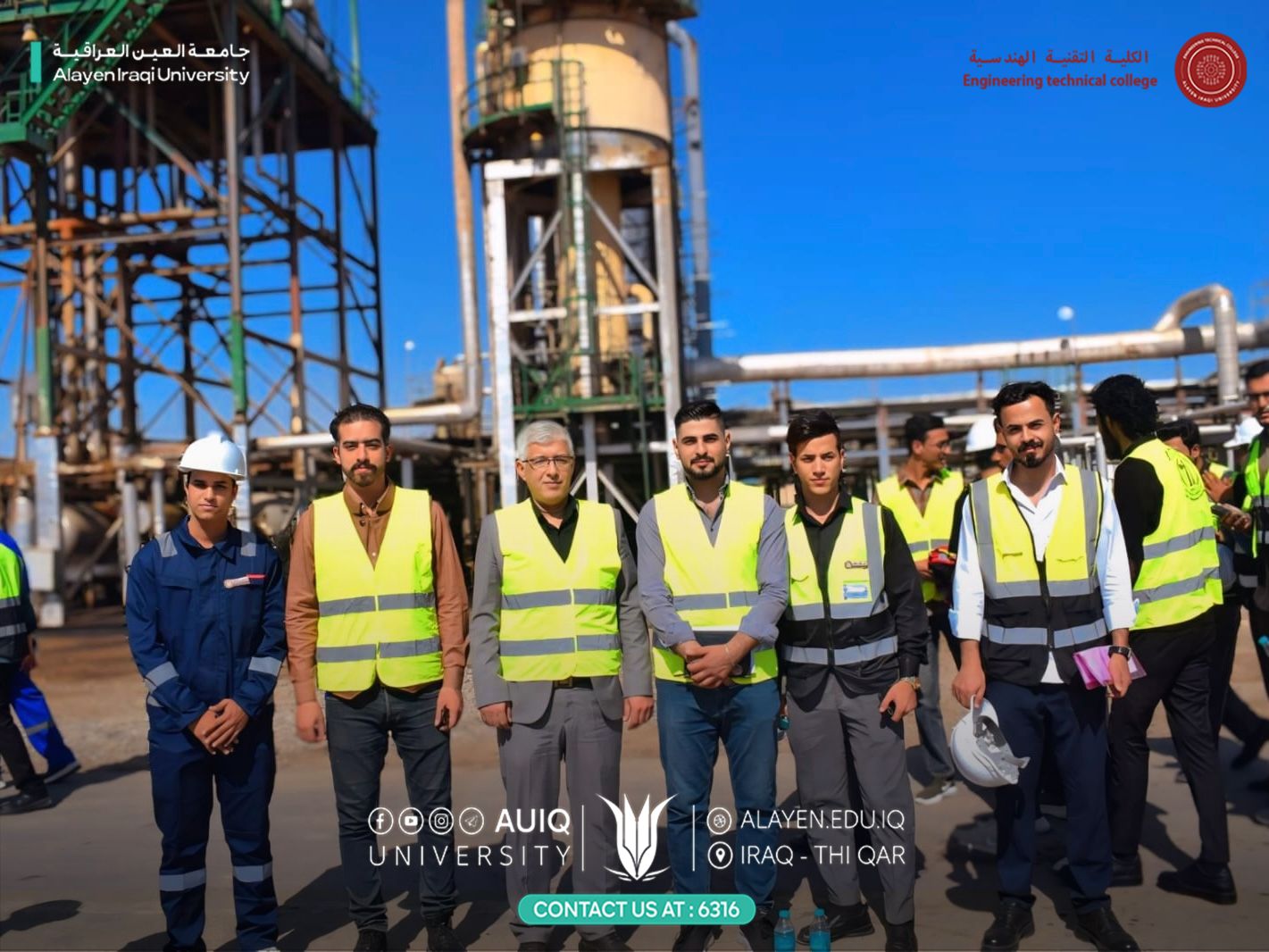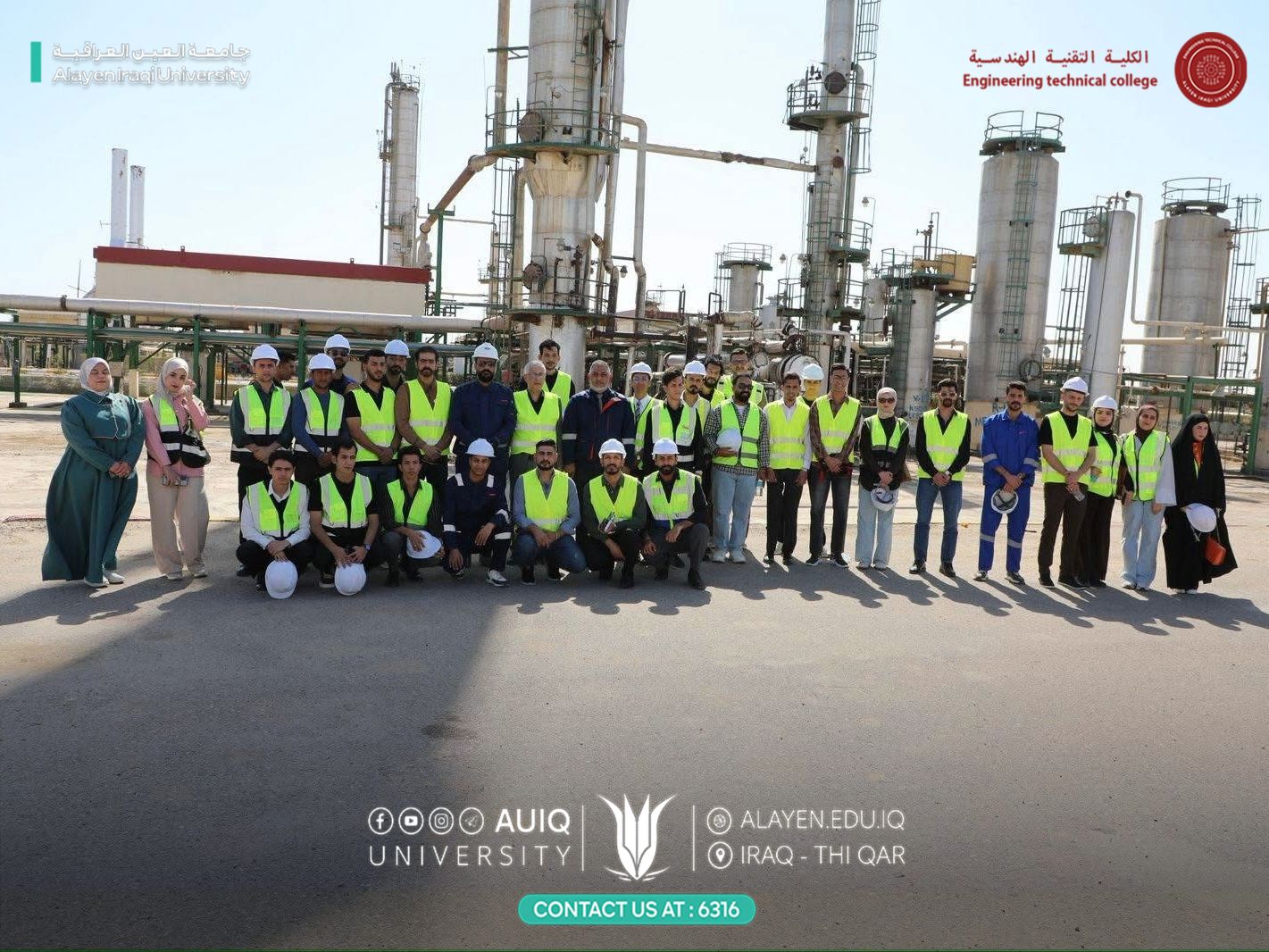 The College of Engineering – Fuel and Energy Department at Al-Ayen University organized a scientific visit to the Dhi Qar Oil Refinery, accompanied by Dr. Fouad Mohammed Fouad and Asst. Prof. Ali Jaafar. The visit aimed to enhance students' practical experience and familiarize them with the operational mechanisms of oil processing units.