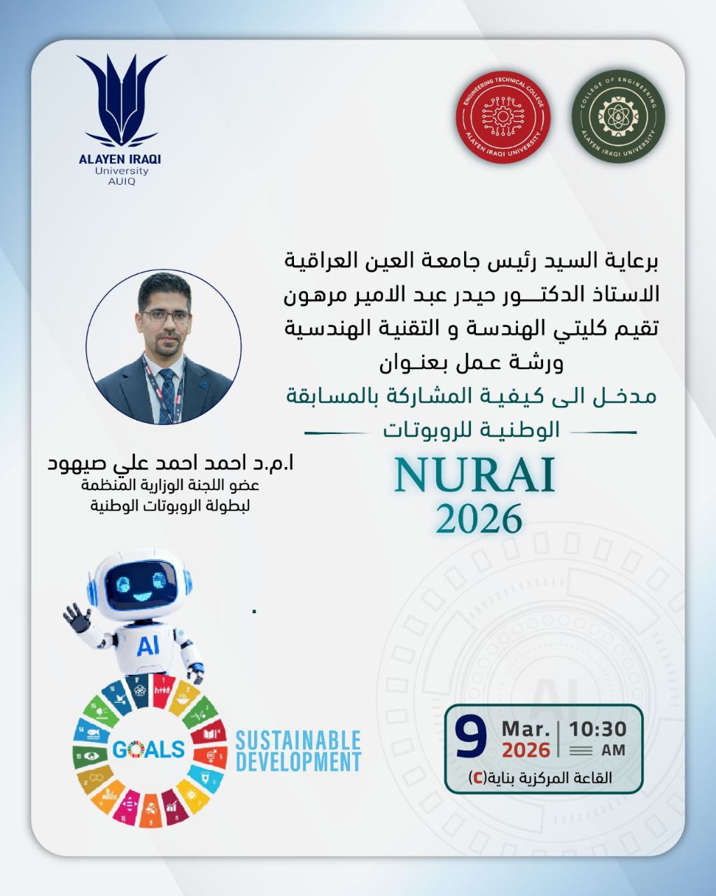 The workshop will be presented by Asst. Prof. Dr. Ahmed Ahmed Ali Sayhood, a member of the Ministerial Organizing Committee for the National Robotics Championship. He will review the competition's participation mechanism, registration requirements, and approved technical standards, in addition to explaining the most important technical aspects related to robot design and programming.6