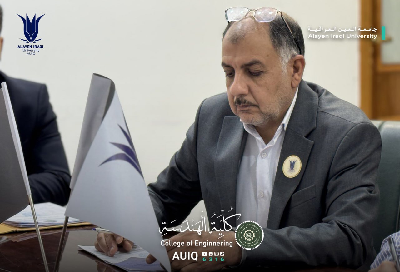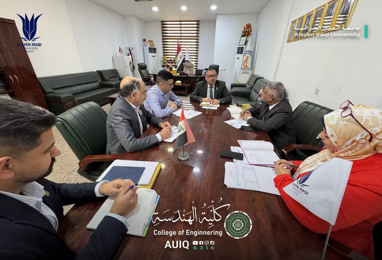 The College of Engineering at Al-Ayen Iraqi University held a meeting of its council, chaired by the Dean, Prof. Dr. Firas F. Kadhim, and attended by the heads of the academic departments and council members. The meeting addressed key academic and administrative developments within the college and focused on enhancing the quality of education and scientific research.