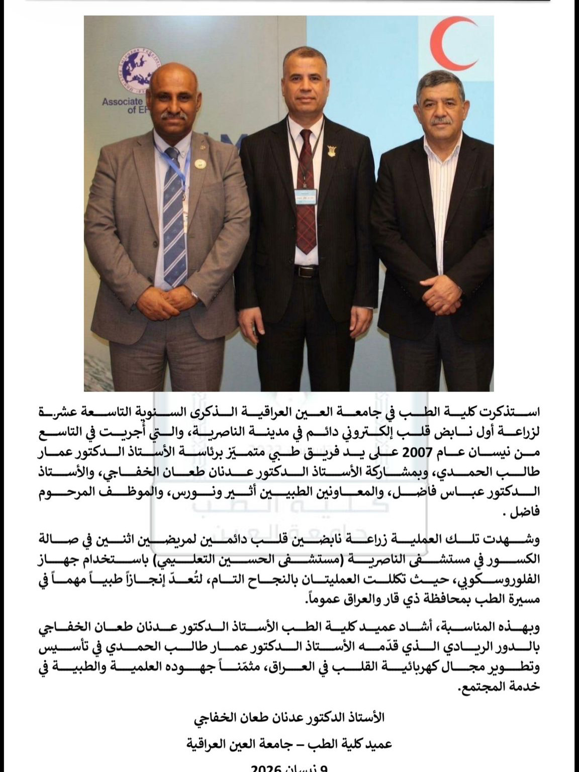 The College of Medicine at Al-Ayen Iraqi University commemorated the 19th anniversary of a pioneering medical achievement: the first permanent pacemaker implantation in Nasiriyah City on April 9, 2007. The procedure was performed by an outstanding medical team led by Prof. Dr. Ammar Talib Al-Hamdi, with the participation of elite physicians, including Prof. Dr. Adnan Taan Al-Khafaji and Prof. Dr. Abbas Fadhil, along with supporting medical staff.