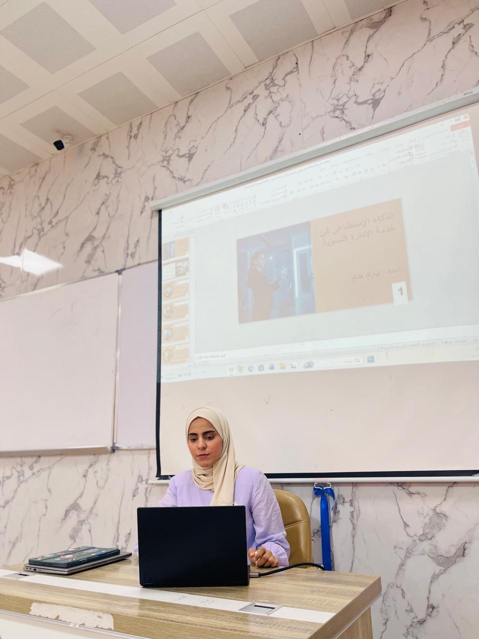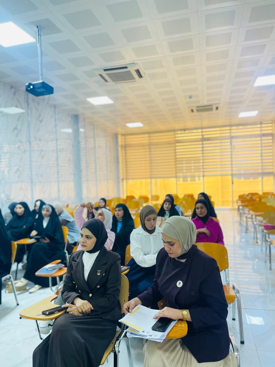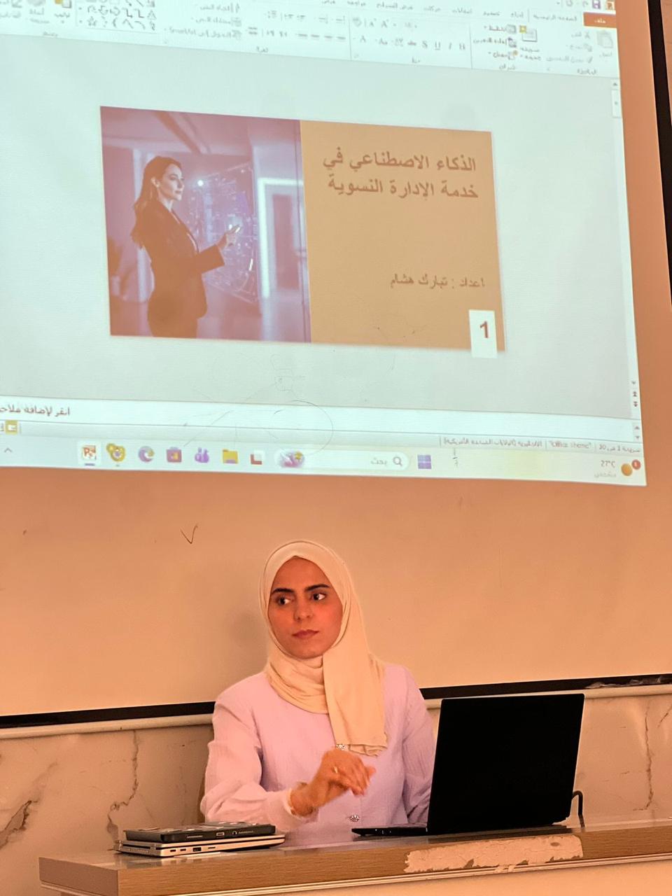 The Women's Affairs Unit at the College of Education, Al-Ayen Iraqi University, organized a scientific seminar on Sunday, April 12, 2026, entitled "Artificial Intelligence in the Service of Women's Management." The seminar was presented by Ms. Tabarak Hisham Awda and attended by a number of faculty members and female students.