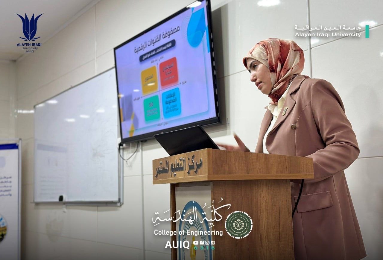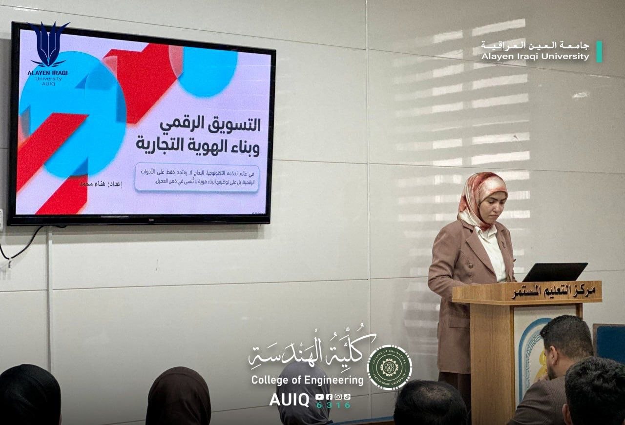 The College of Engineering at Al-Ayen Iraqi University, in cooperation with the Continuing Education Center, organized a training workshop entitled “Digital Marketing and Building a Brand Identity,” presented by Ms. Hanaa Mohammed, with the participation of a number of the college’s students.