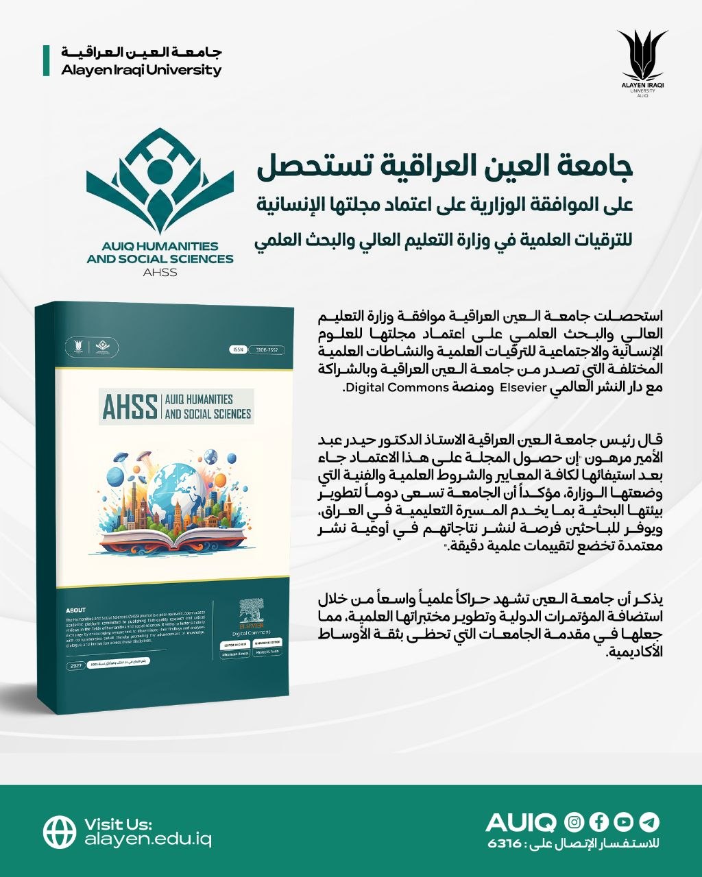 Al-Ayen Iraqi University has obtained approval from the Ministry of Higher Education and Scientific Research to accredit its Journal of Humanities and Social Sciences for academic promotions and various scientific activities. Which is published in partnership with the international publishing house Elsevier and the Digital Commons platform.