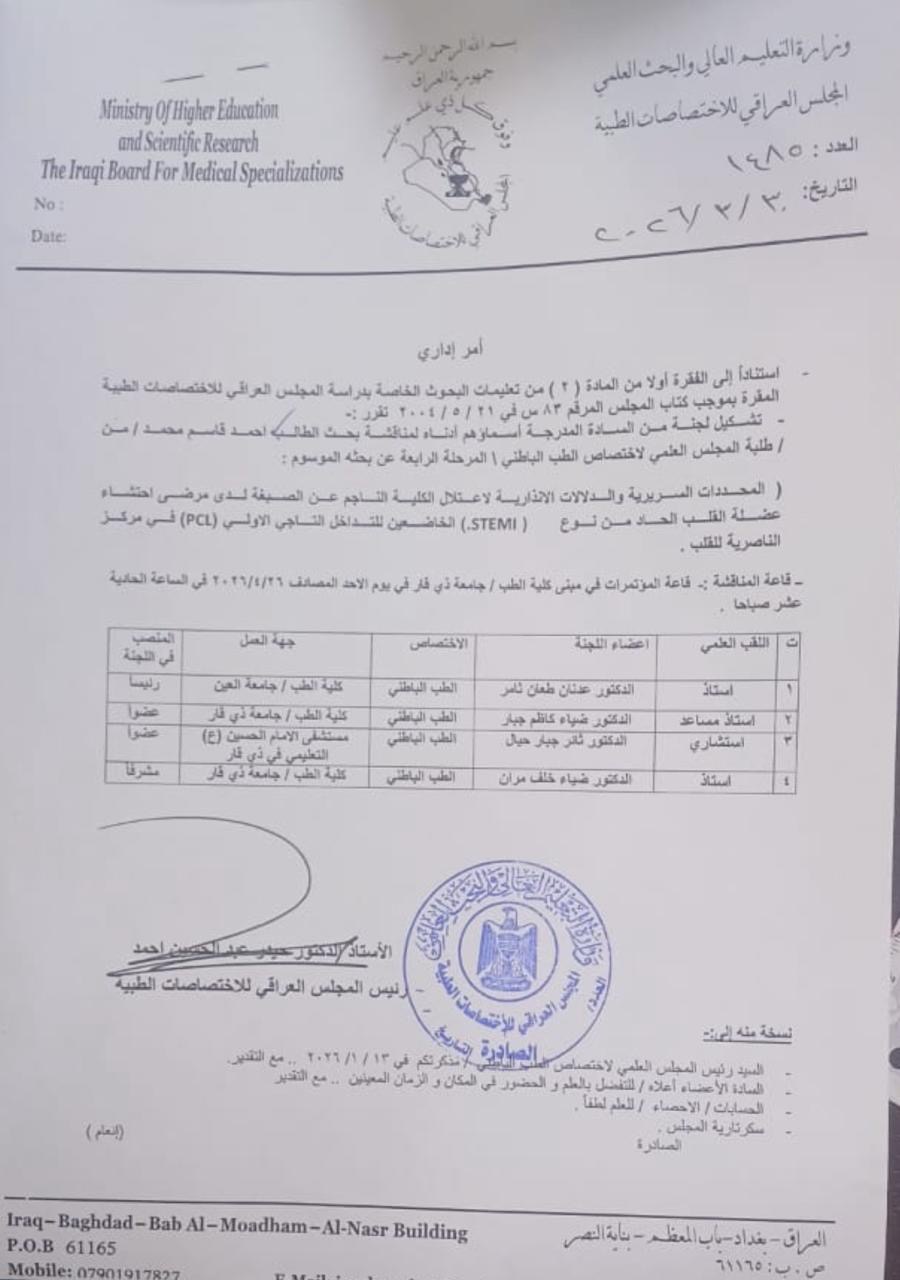 The Iraqi Board for Medical Specialties issued an administrative order forming a scientific committee to discuss a specialized research paper in the field of internal medicine under the auspices of the Ministry of Higher Education and Scientific Research. This initiative aims to support academic activity and enhance the quality of medical research.