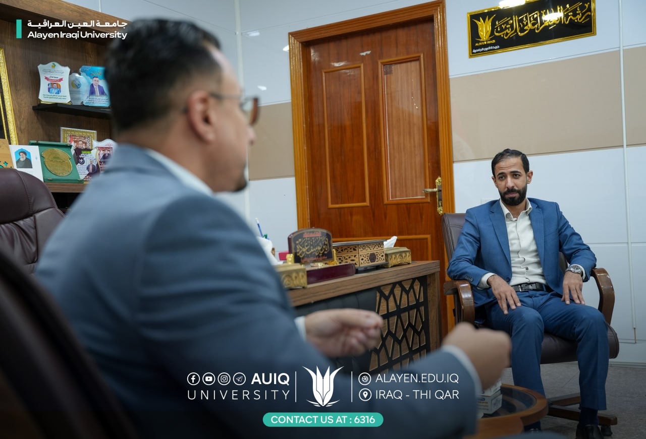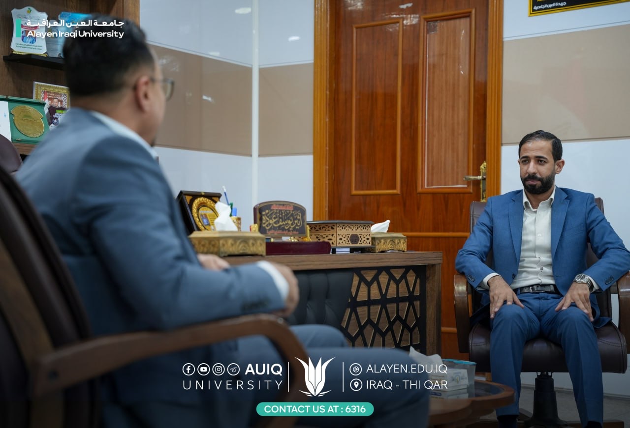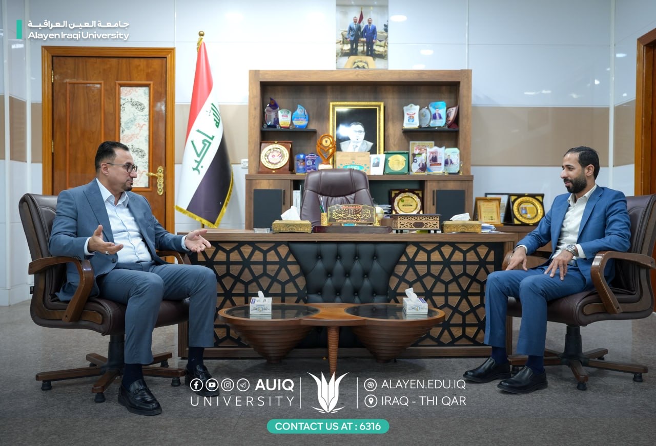 On Sunday, April 26, 2026, Asst. Prof. Dr. Atheer Y. Awda, Deputy Chancellor of Al-Ayen University for Administrative Affairs, received Member of Parliament Qastal Al-Ajil Al-Hajami to discuss the current state of the educational institution and its role in serving the people of Dhi Qar Province.