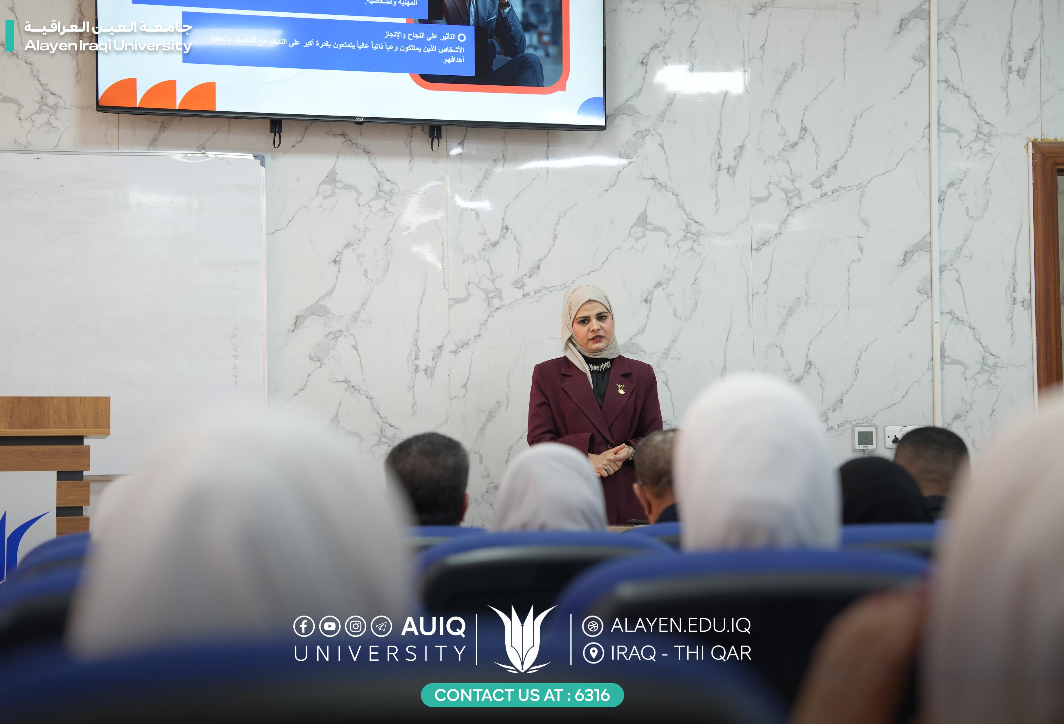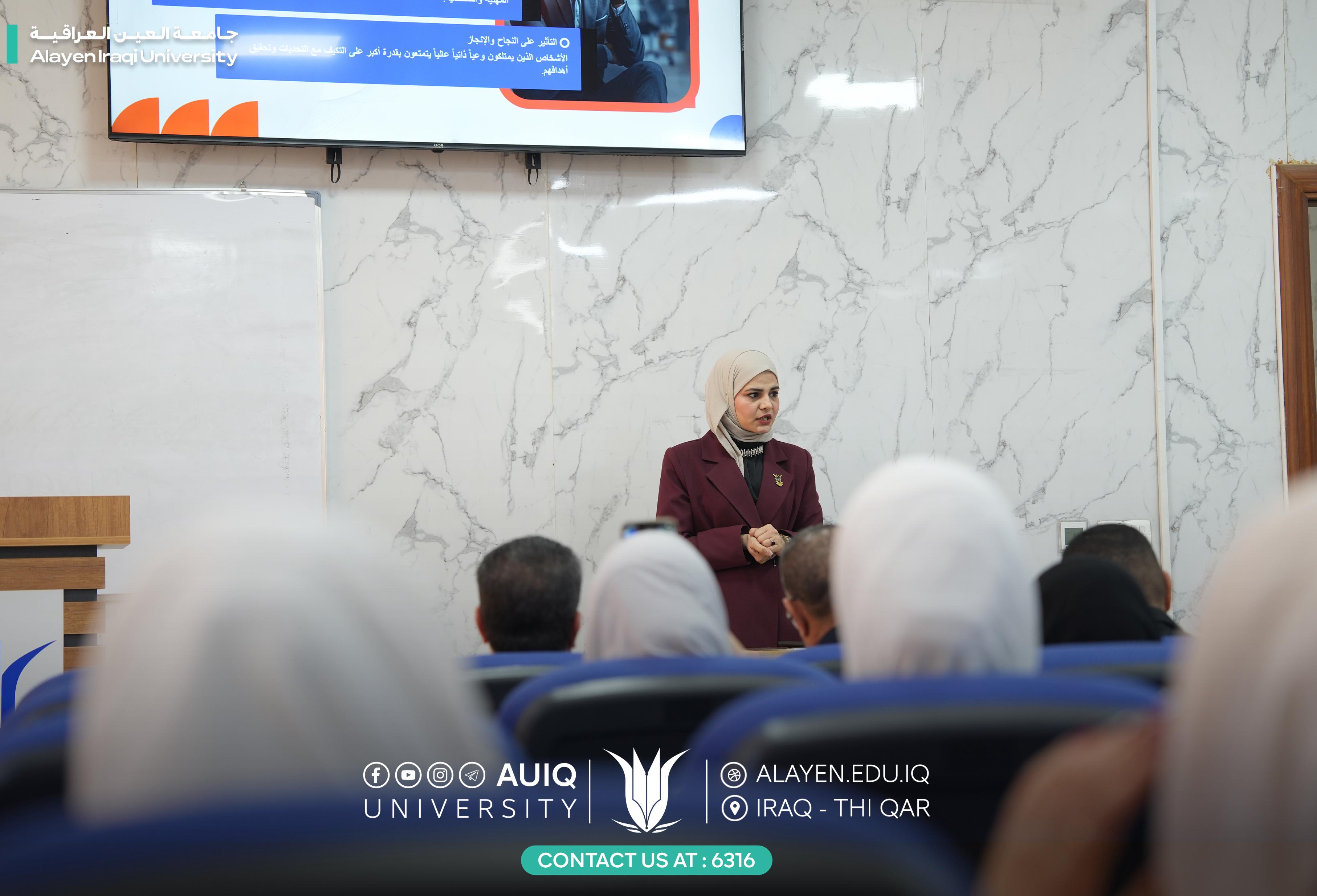 The University Psychological Counseling Unit at Al-Ayen Iraqi University held a training course entitled “Discover Yourself and Set Your Goals,” presented by the unit head, Asst. Lecturer. Sara Mohammed Abdul Khader Salal, and attended by the Director of the Continuing Education Center, Mr. Abdul Rahman Al-Batat, along with a number of students and faculty members.